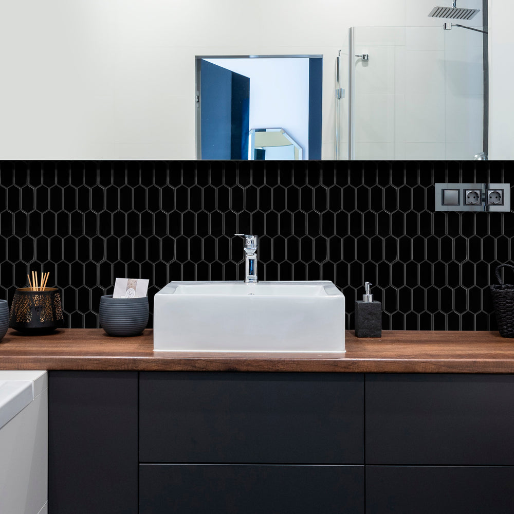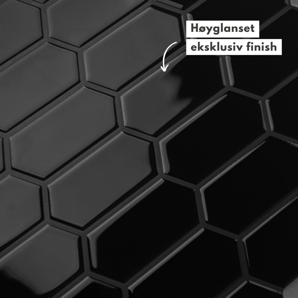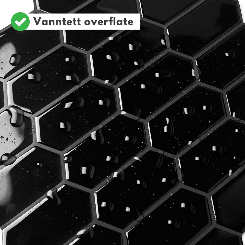 Selvklebende svarte veggfliser i blank hexagon-design – moderne og stilrene fliser til kjøkken og bad