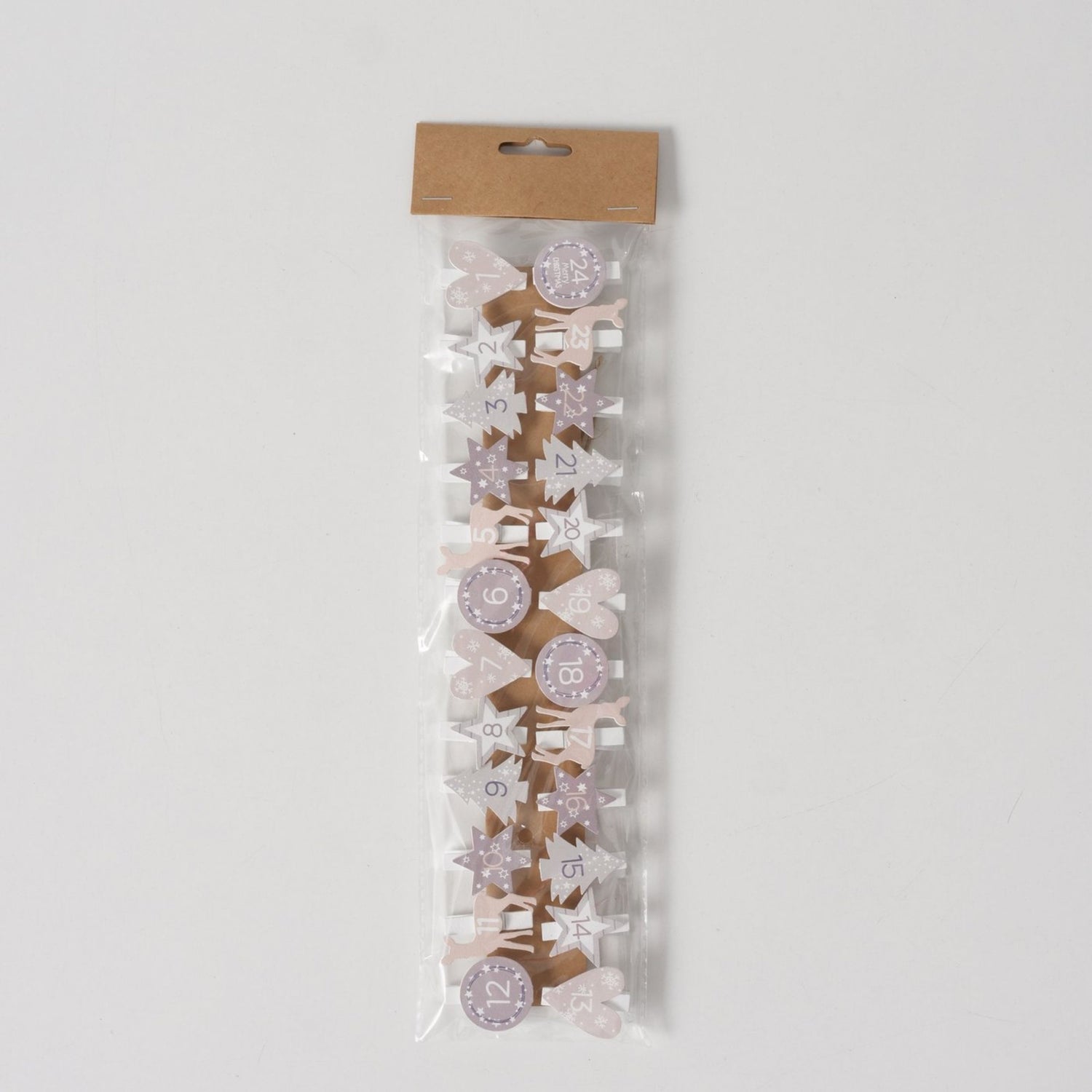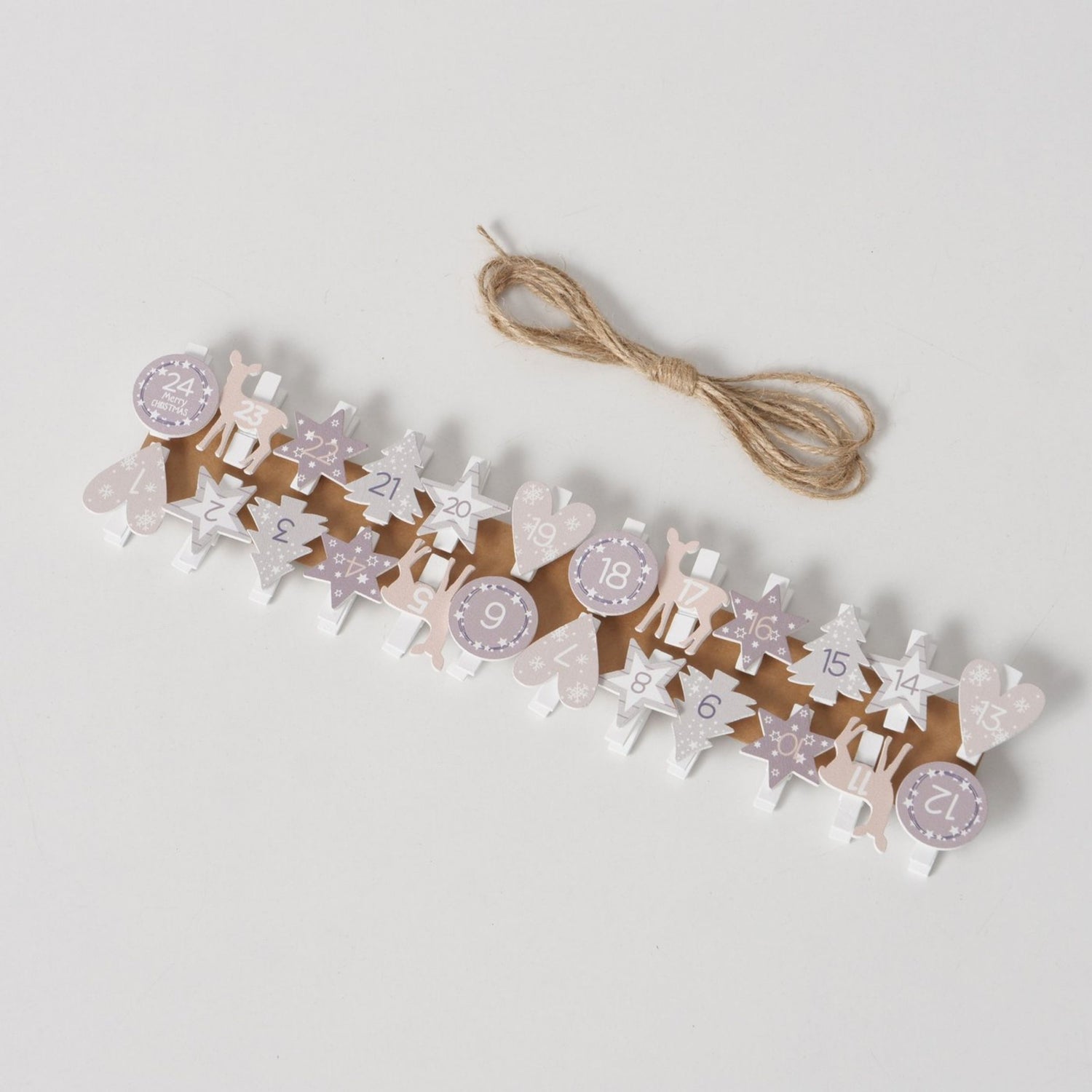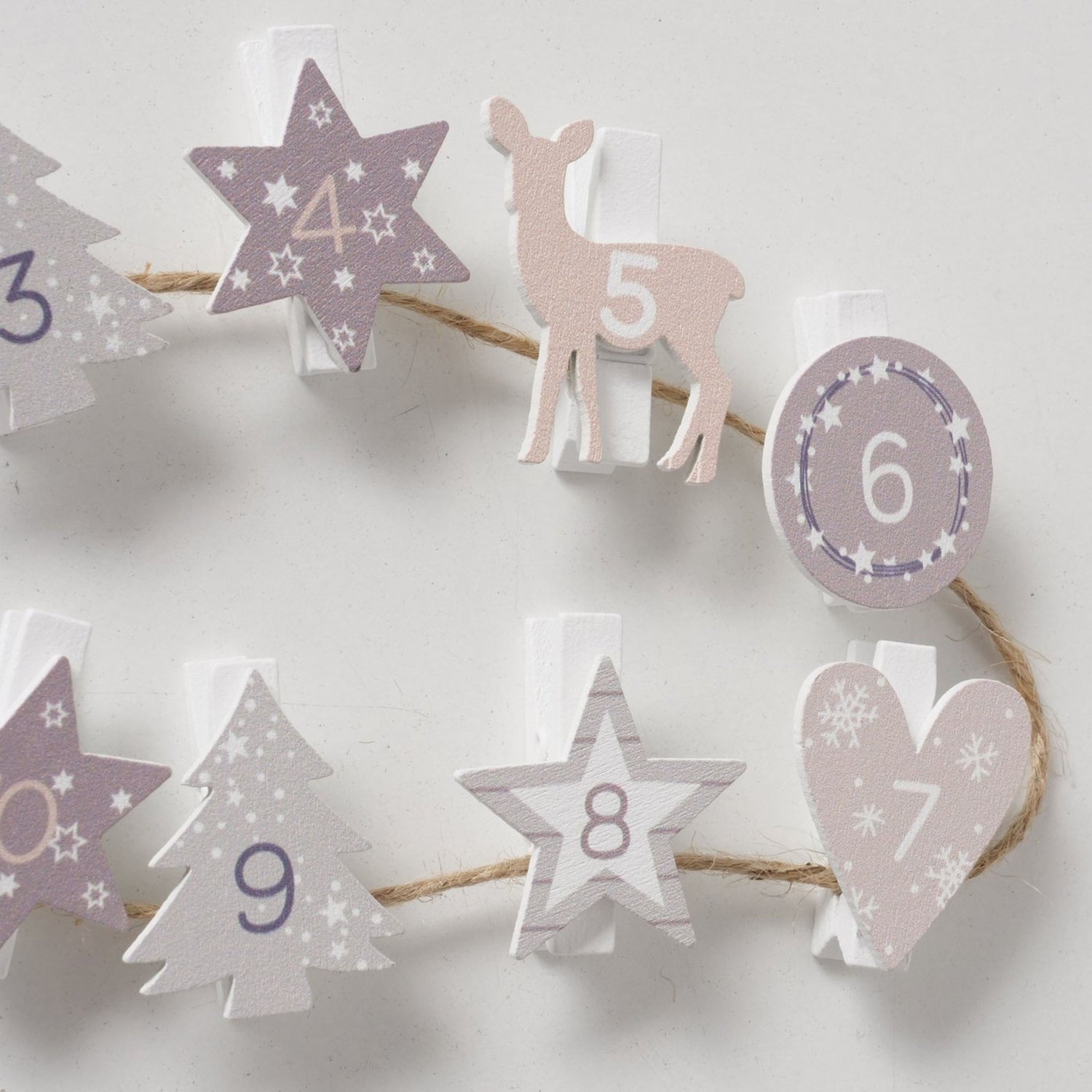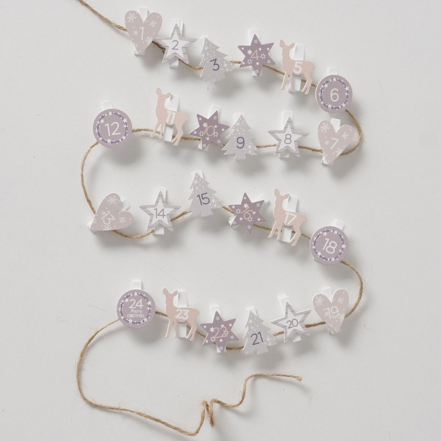 Tell ned til jul med denne vakre adventskalenderen i form av en girlander. Kalenderen består av 24 nummererte klips formet som stjerner, hjerter, juletrær og små hjortedekorasjoner, perfekt for å henge opp små gaver, lapper eller andre overraskelser.