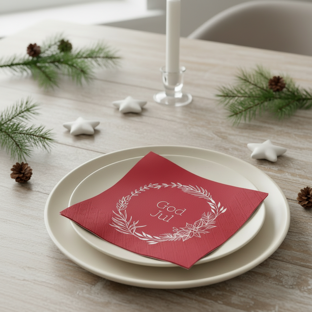 Røde servietter med teksten God jul i hvit. Serviettene er 3-lagspapirservietter og kommer i en pakke med 20 stk. Disse serviettene er perfekt til julehøytiden.