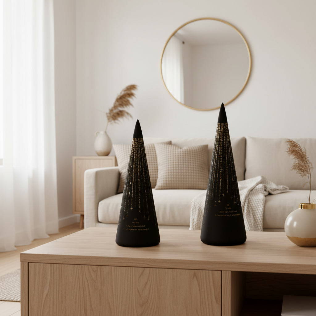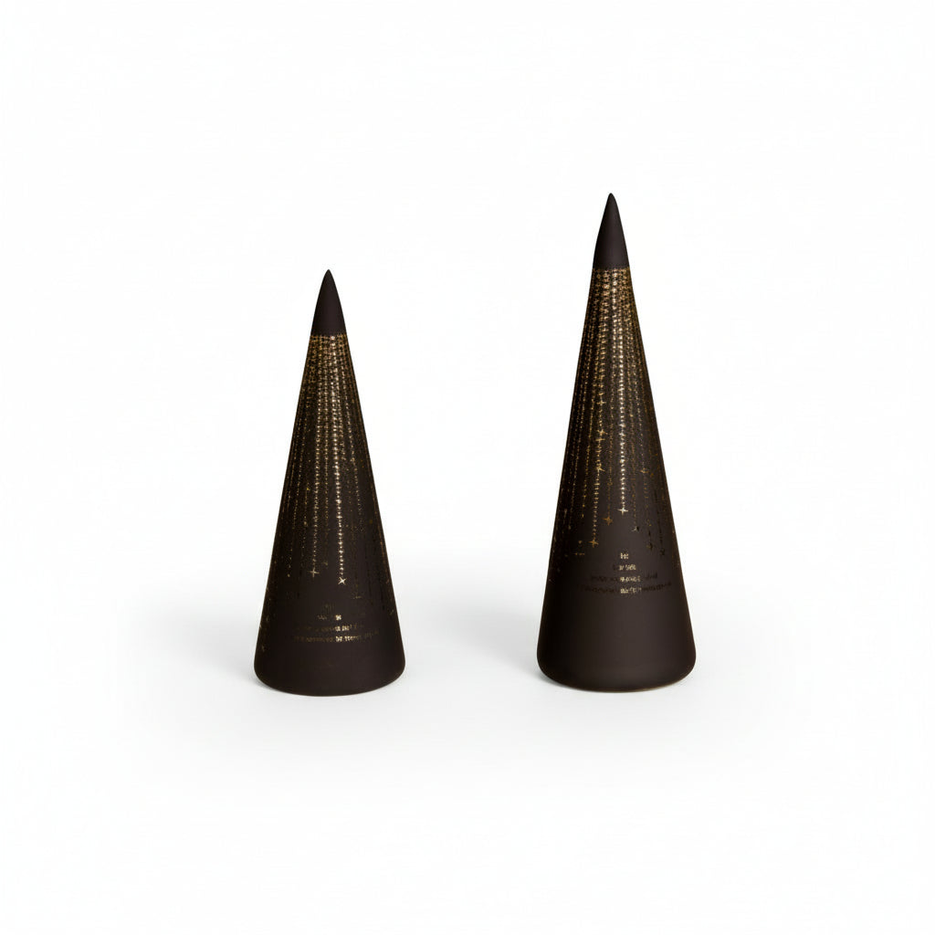 Gi hjemmet en rolig og varm atmosfære med dette settet av sorte LED-lyslykter i kjegleform. De utskårne stjernene gir et vakkert lysspill når LED-pærene tennes, og skaper en behagelig stemning både i stuen, på hyllen eller i vinduskarmen.