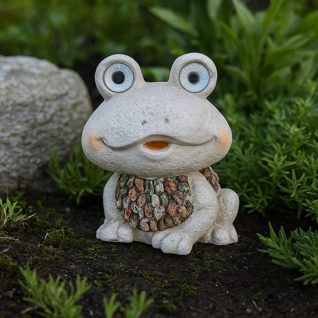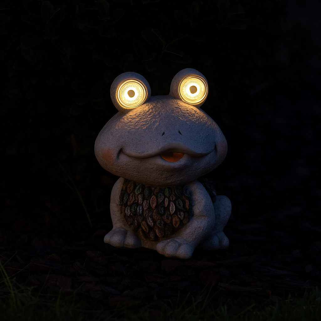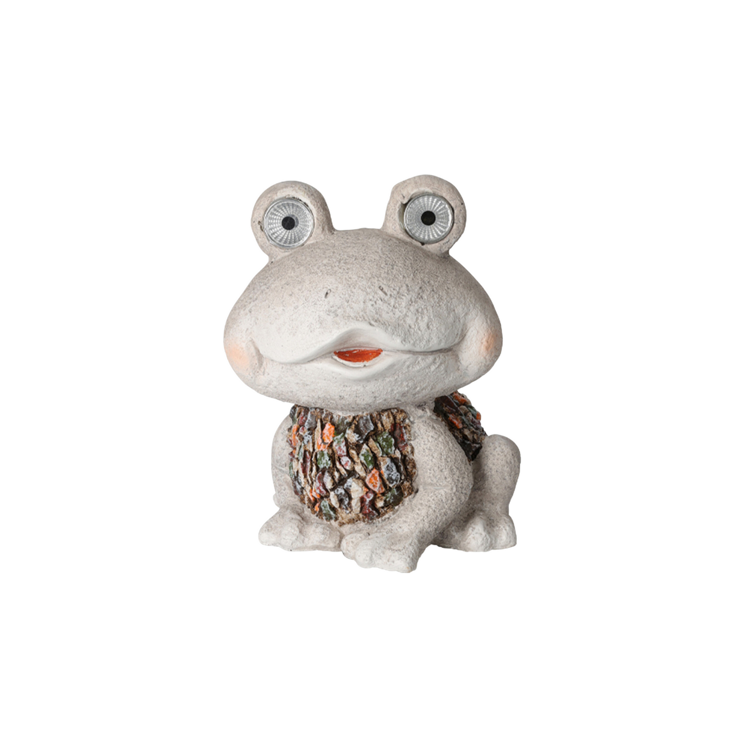 Froskine er en søt og dekorativ hagefigur som lyser opp uterommet med sitt vennlige uttrykk og store øyne med innebygde solcelle-LED-lys. Den fargerike kroppen gir figuren et unikt og livlig preg.