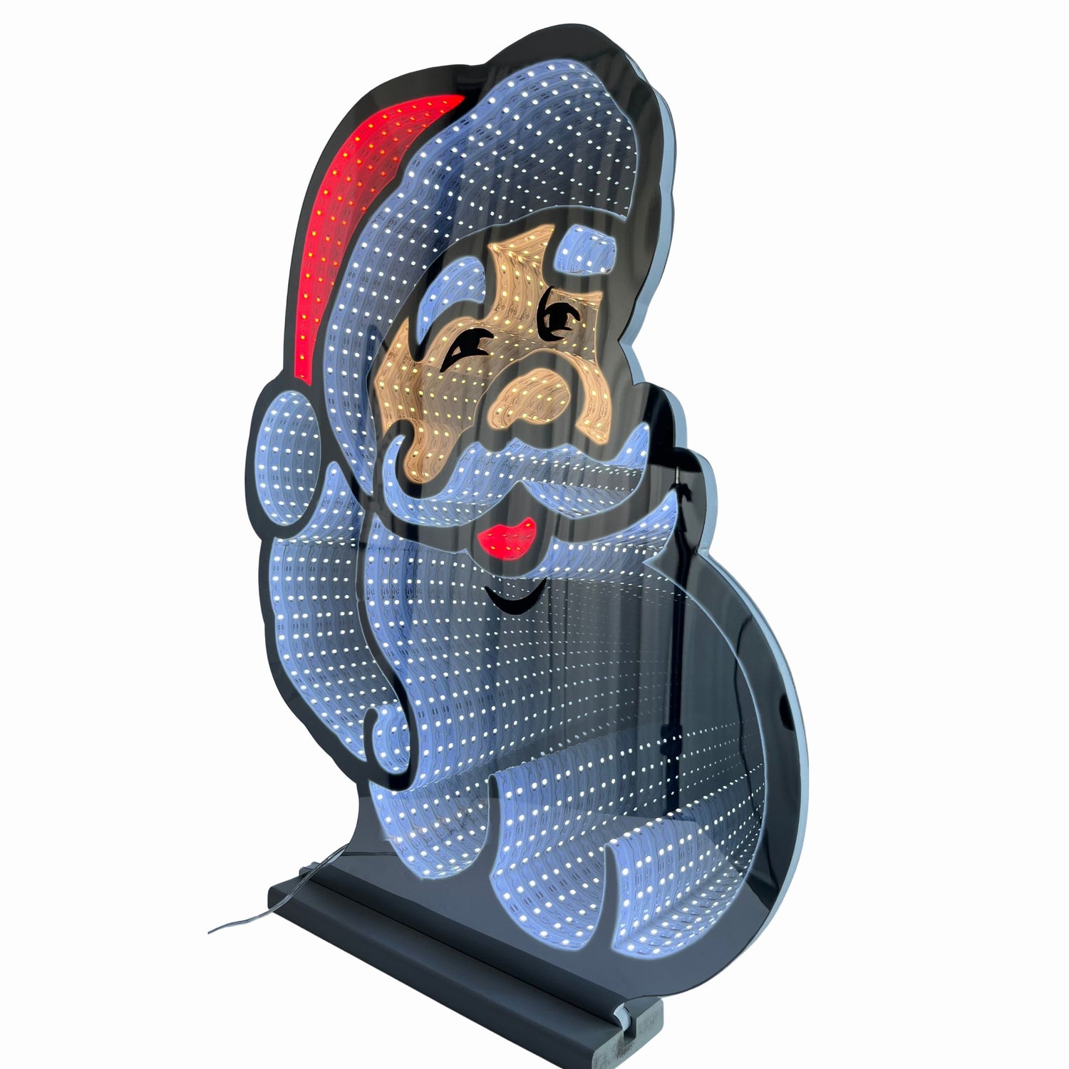 Skap magi i julen med Infinity speil Nisse ansikt. Denne dekorasjonen kombinerer klassisk julenostalgi med moderne lysdesign. Når LED-lysene tennes, skaper speilet en illusjon av uendelig dybde, og nissens ansikt får et levende og stemningsfullt uttrykk.