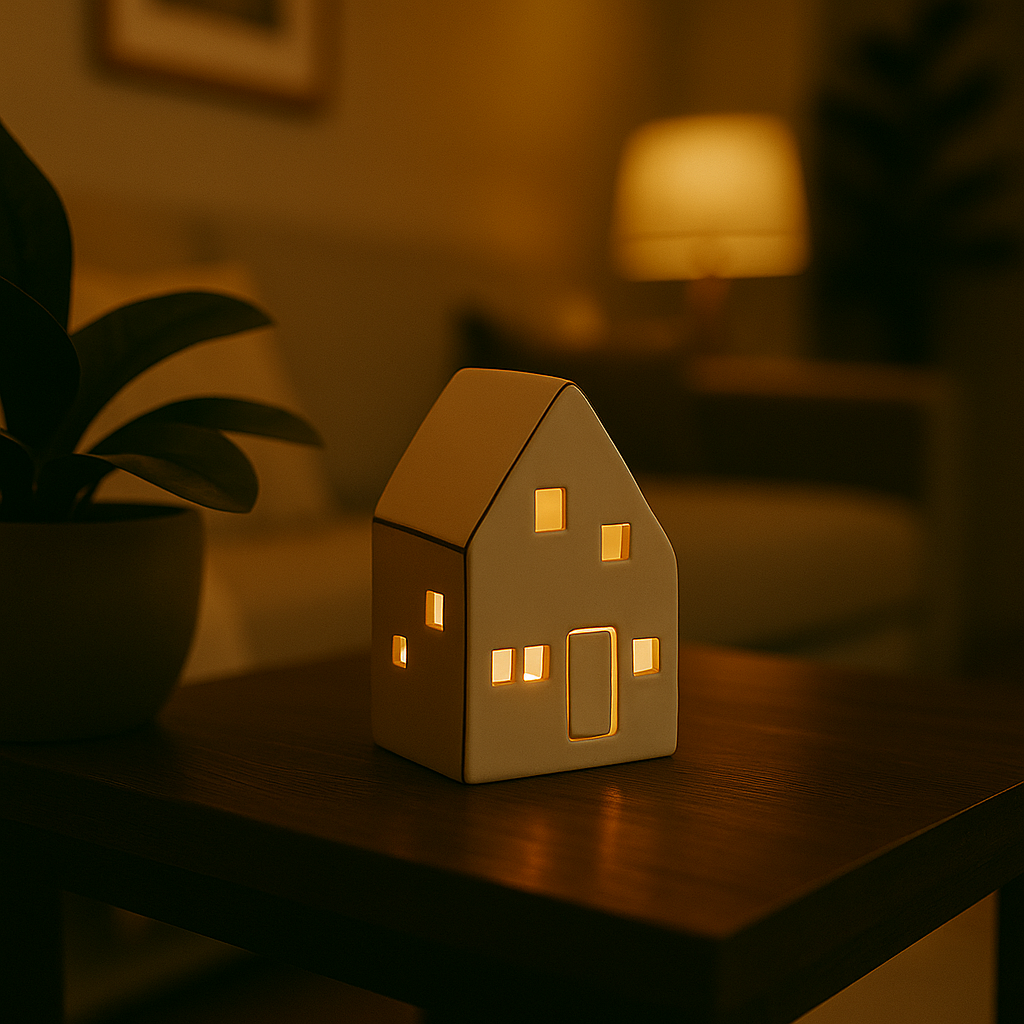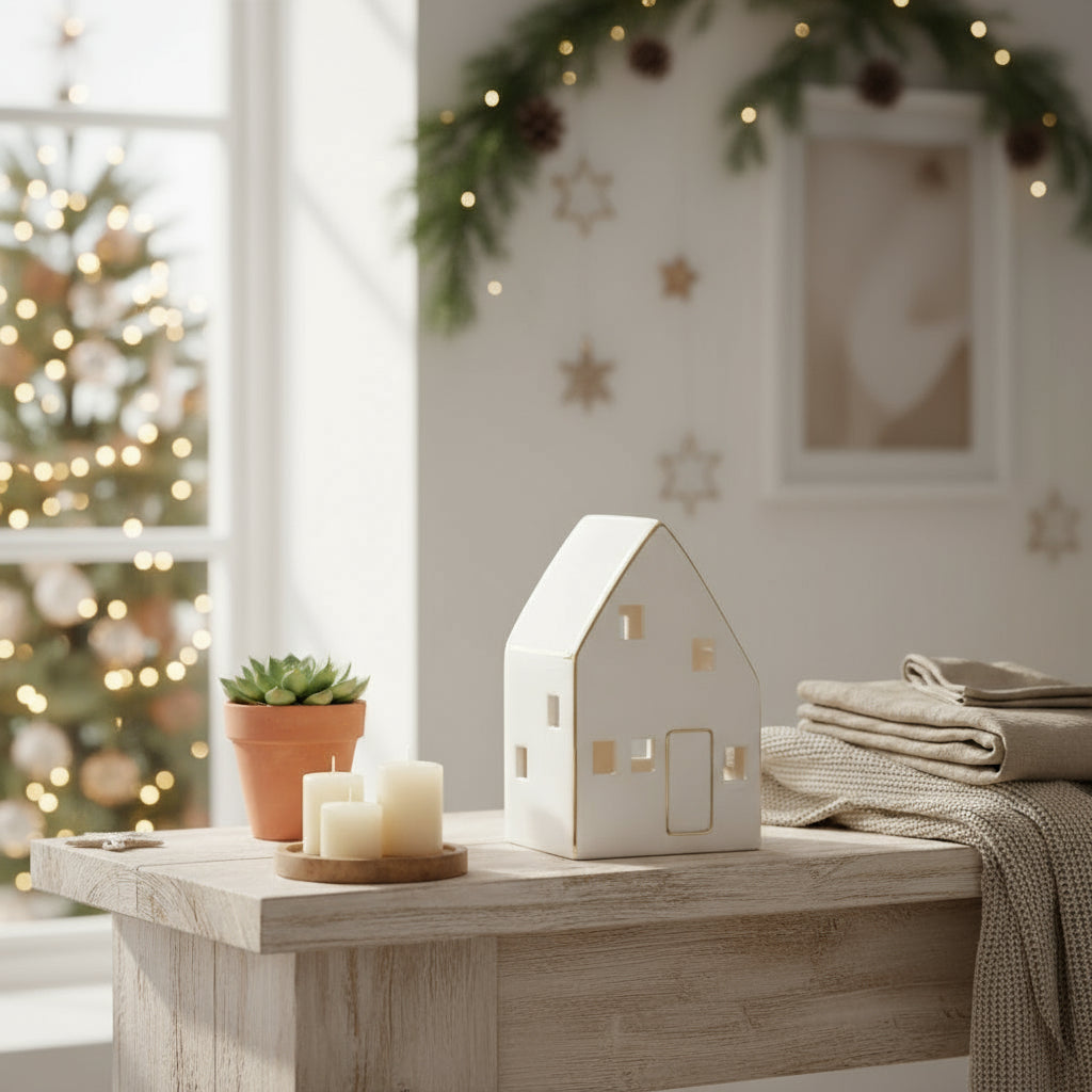 Nordby liten er et dekorativt keramikkhus med innebygd LED-lys som gir en myk og varm glød. De små vinduene slipper lyset fint gjennom og skaper en rolig stemning i rommet. De diskrete gullfargede detaljene gir et hint av eleganse uten å ta for mye oppmerksomhet.