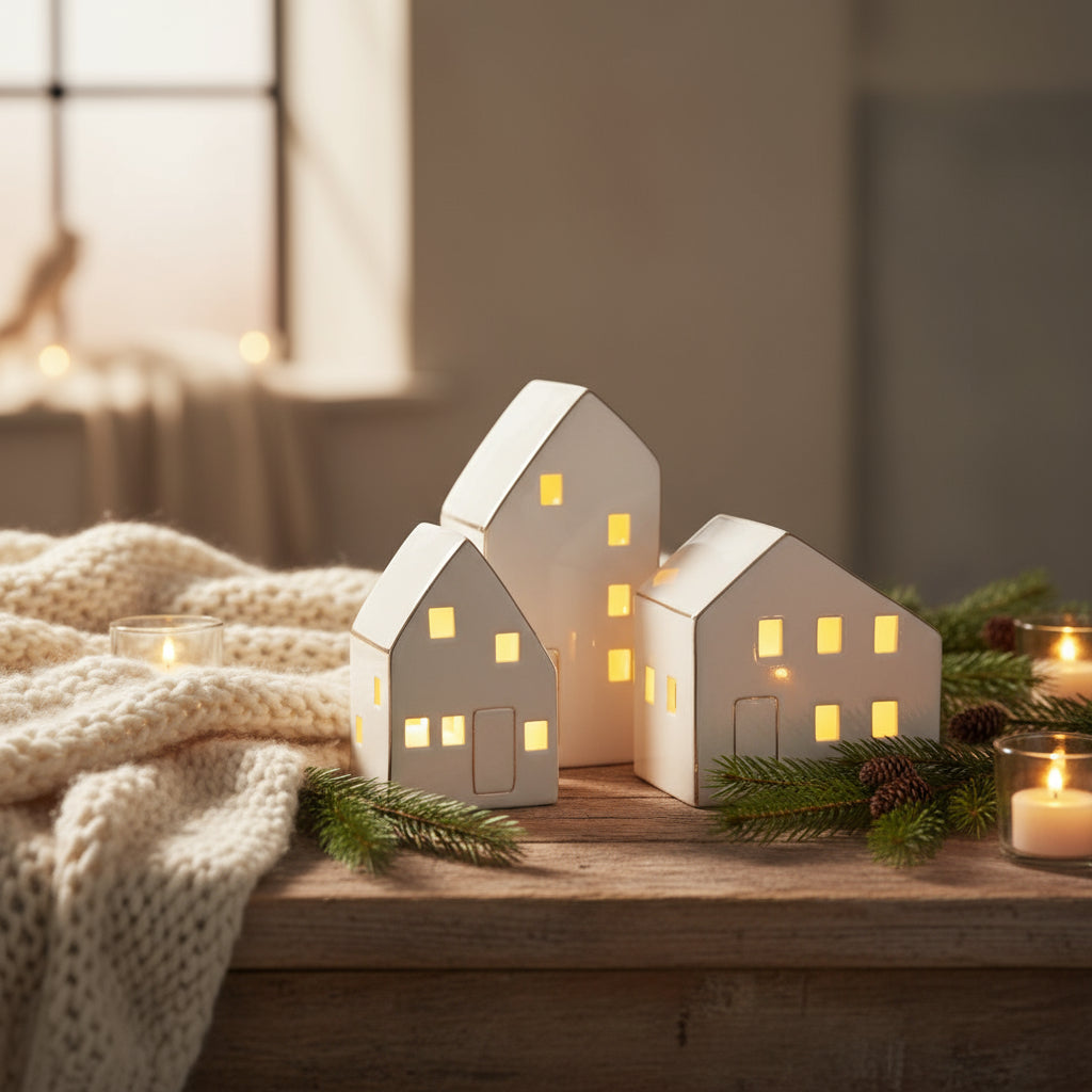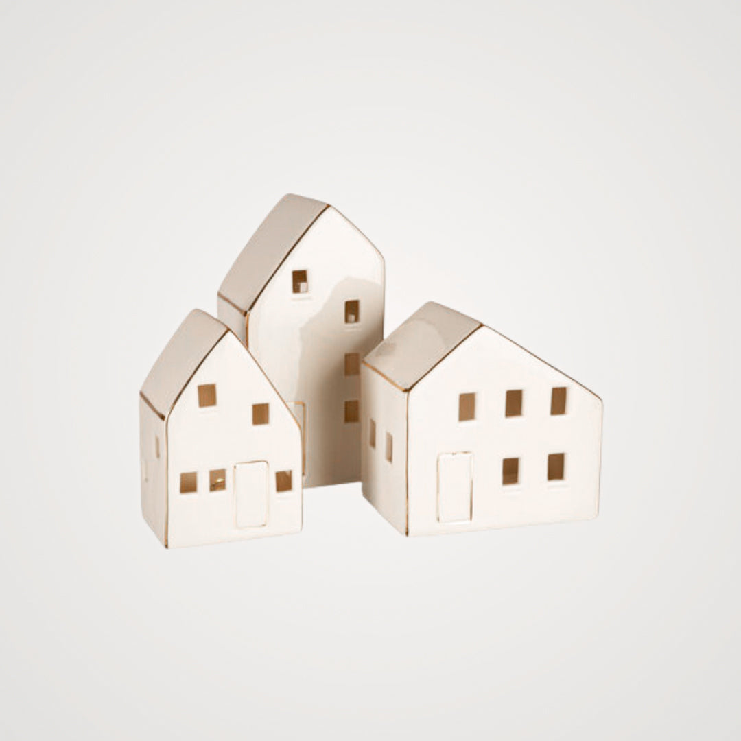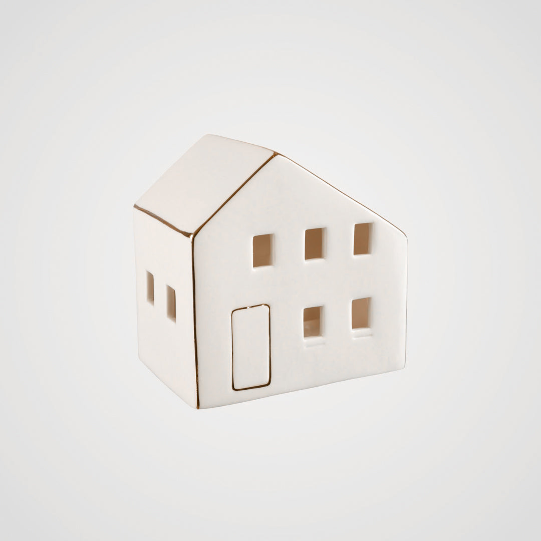 Hvitt keramikkhus med skråtak, sett fra skrå vinkel mot nøytral bakgrunn.