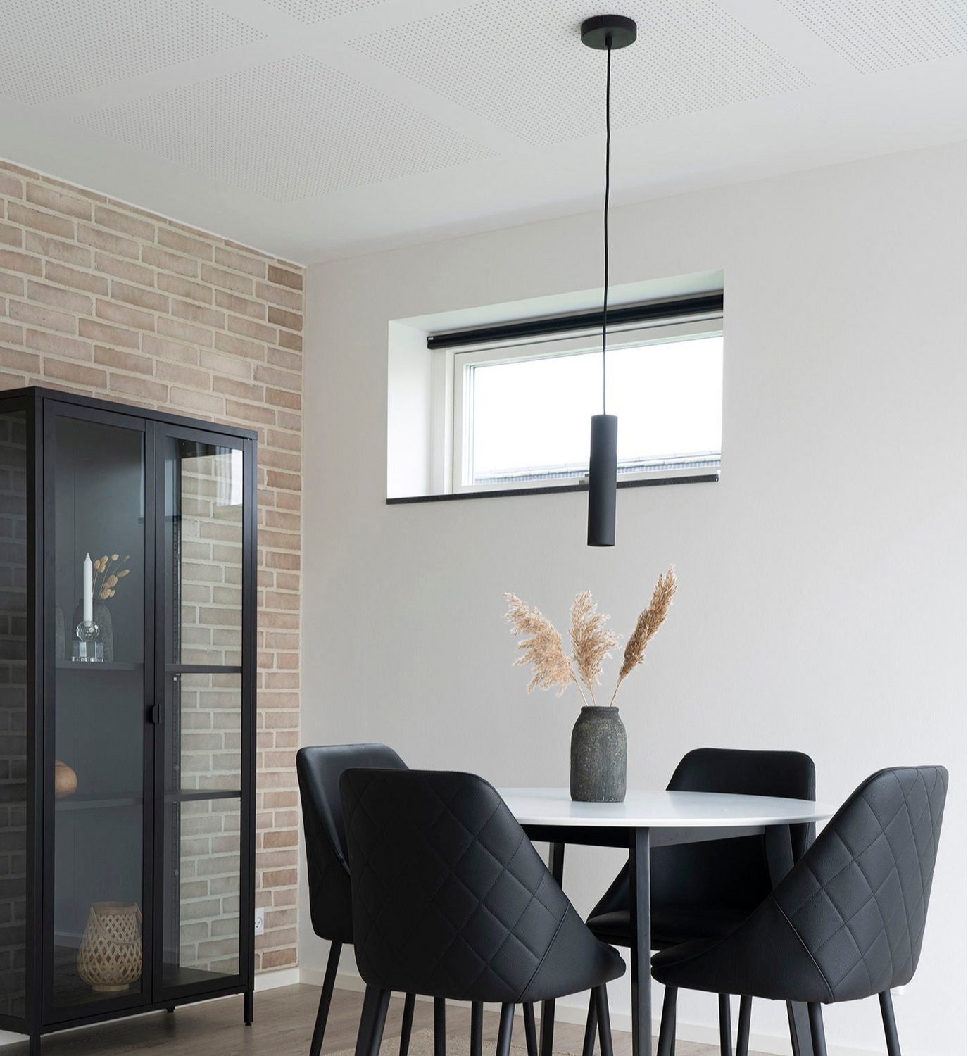 Pendellampe i sort stål med et enkelt sylinderdesign som gir et moderne uttrykk. Lampen passer perfekt over spisebord, kjøkkenøy eller som punktbelysning. Leveres med sort tekstilledning på 120 cm.