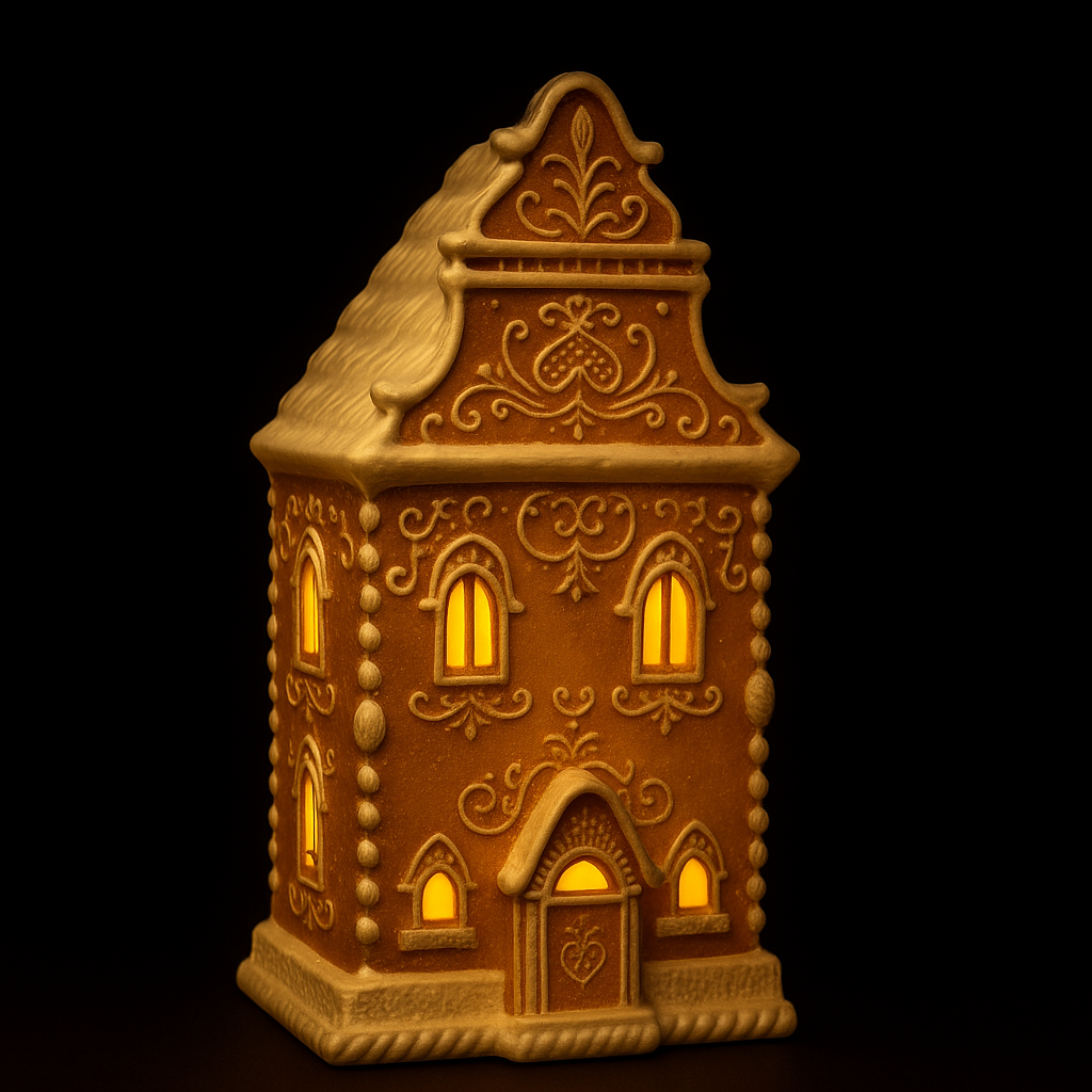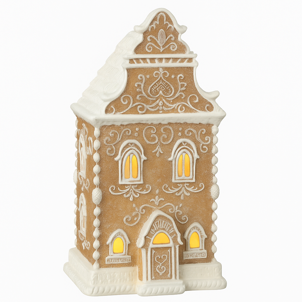Pepperkakehus i polyresin sett fra siden med hvit glasur-inspirert dekor.