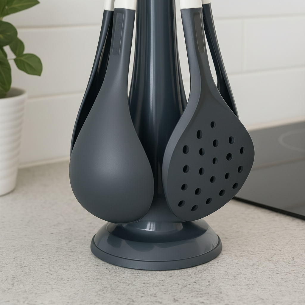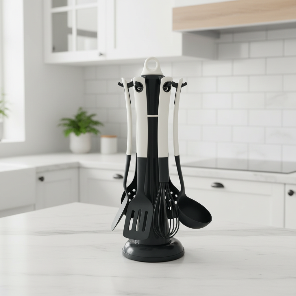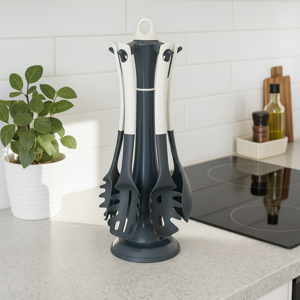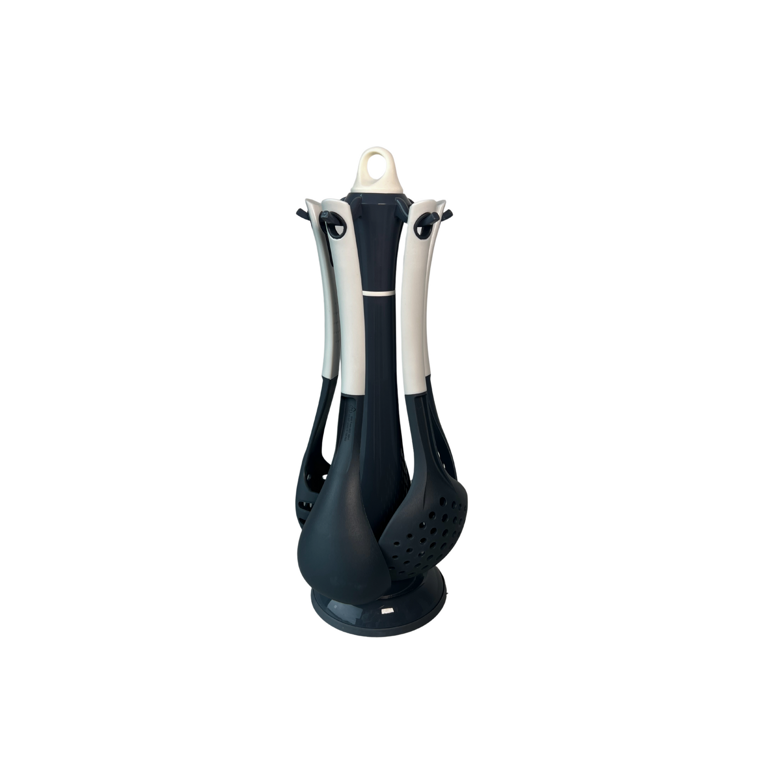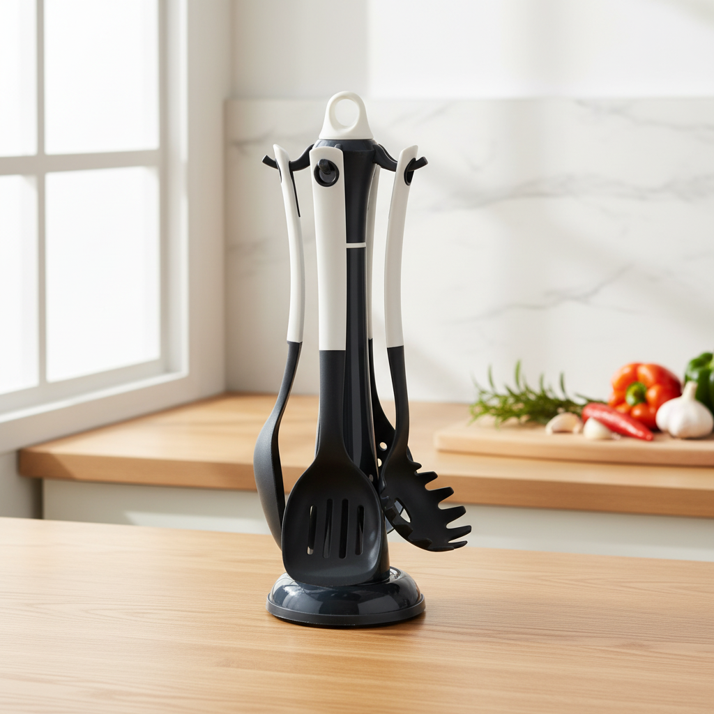 Settet består av fem essensielle kjøkkenredskaper og et praktisk stativ som holder alt organisert og lett tilgjengelig . Perfekt for både nybegynnere og profesjonelle kokker.
