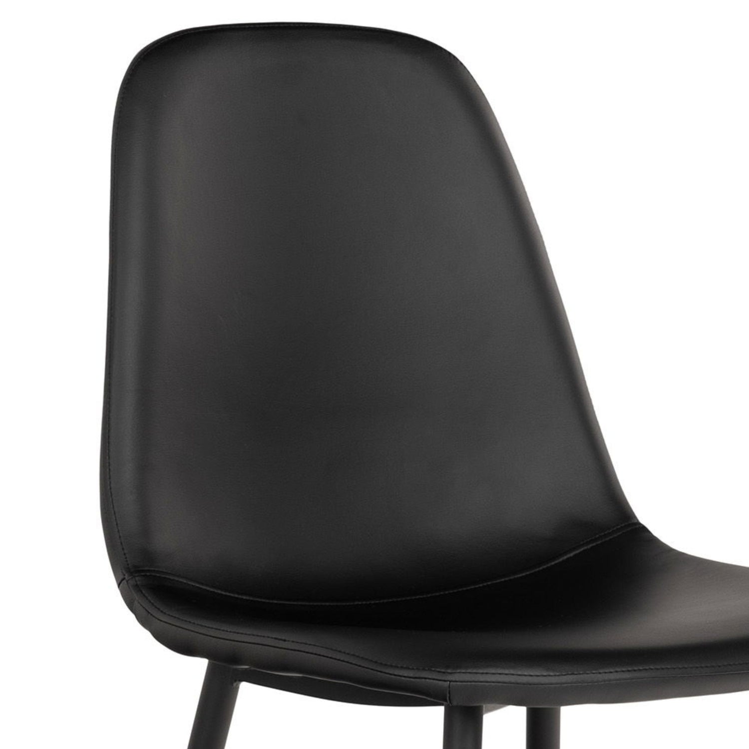 Stolen har et sete i svart PU-skinn og sorte metallben som gir et minimalistisk uttrykk. Med høy rygg og behagelig sittekomfort er den like egnet til hverdagsbruk som til lange middager.