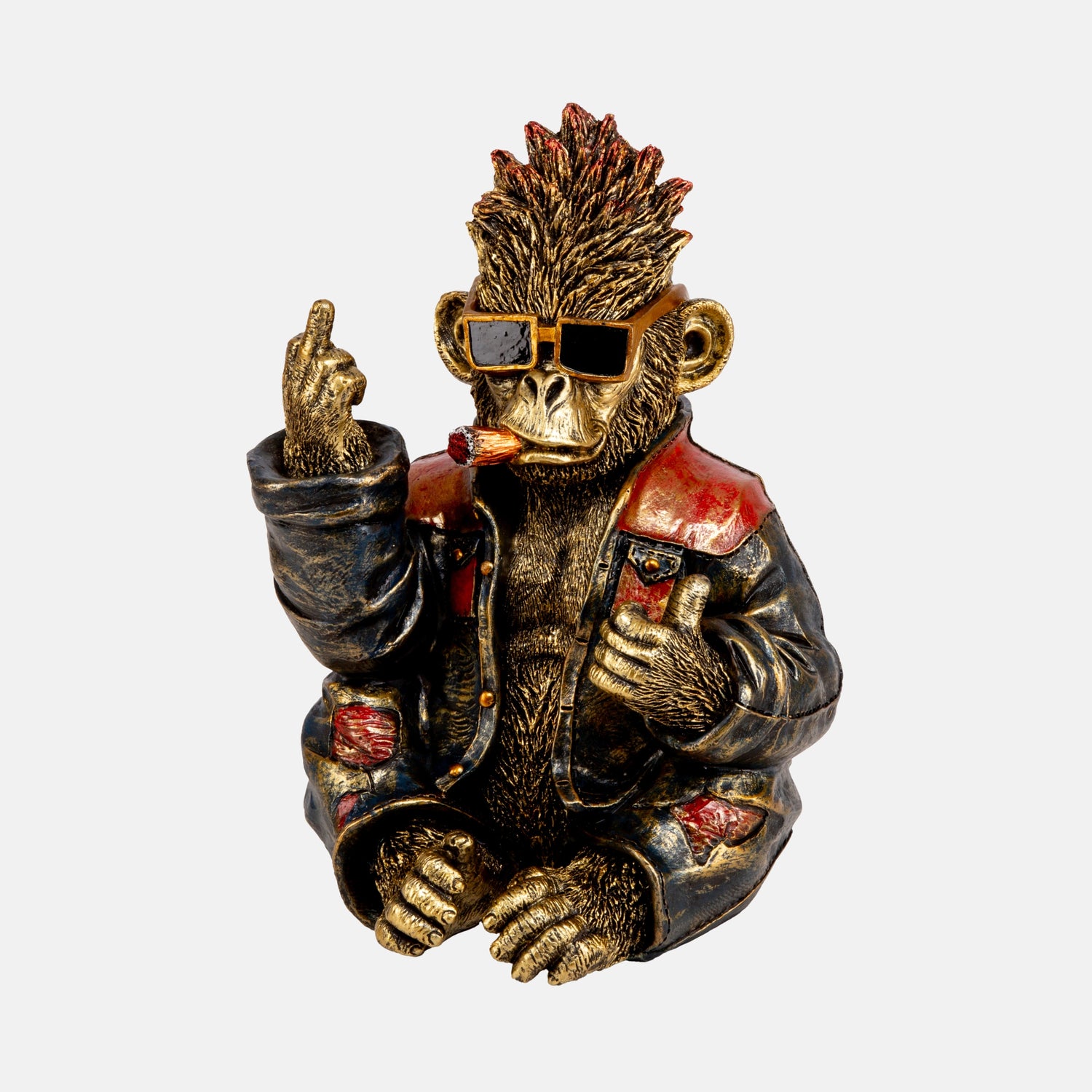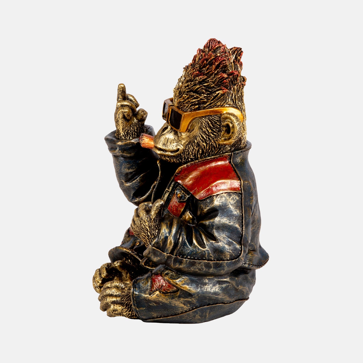 Gi interiøret et lekent og edgy preg med denne unike apefiguren i rockestil. Figuren viser en selvsikker ape med solbriller, skinnjakke og sigar, perfekt for deg som liker kunst med personlighet og humor.