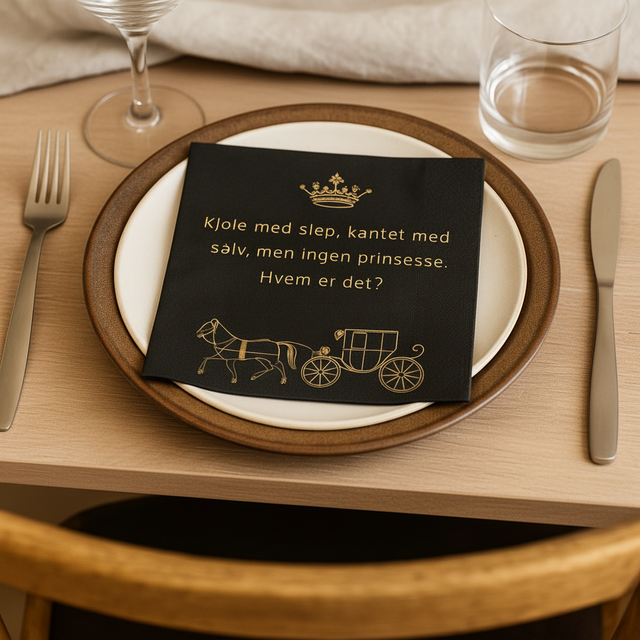 Skap en magisk stemning rundt bordet med Serviett Askepott. Disse stilfulle lunsjserviettene i sort er dekorert med elegant gulltrykk.