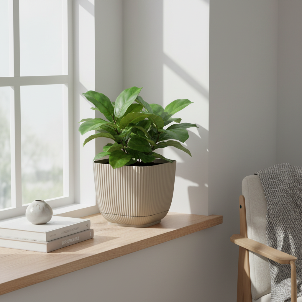 Potten har et moderne, rillet design og en myk, matt overflate som passer perfekt inn i både klassiske og minimalistiske interiørstiler. Den er laget i slitesterk plast og kommer med en integrert skål i bunnen for å fange opp overflødig vann, praktisk for både inne og utebruk.