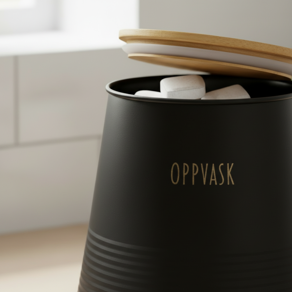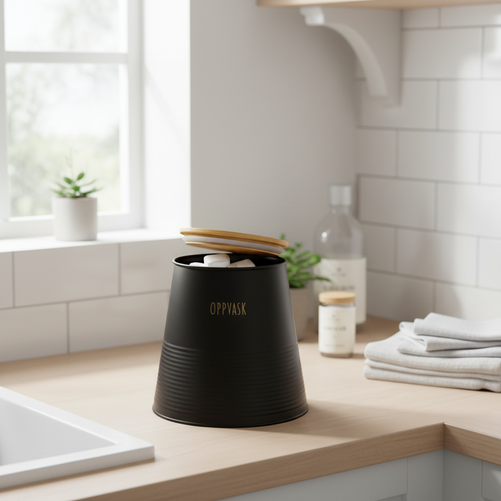 Boks til oppvaskmiddel i sort metall med bambus lokk. Denne flotte boksen har moderne og stilfult design og kan godt stå fremme på kjøkkenbenken til pynt.