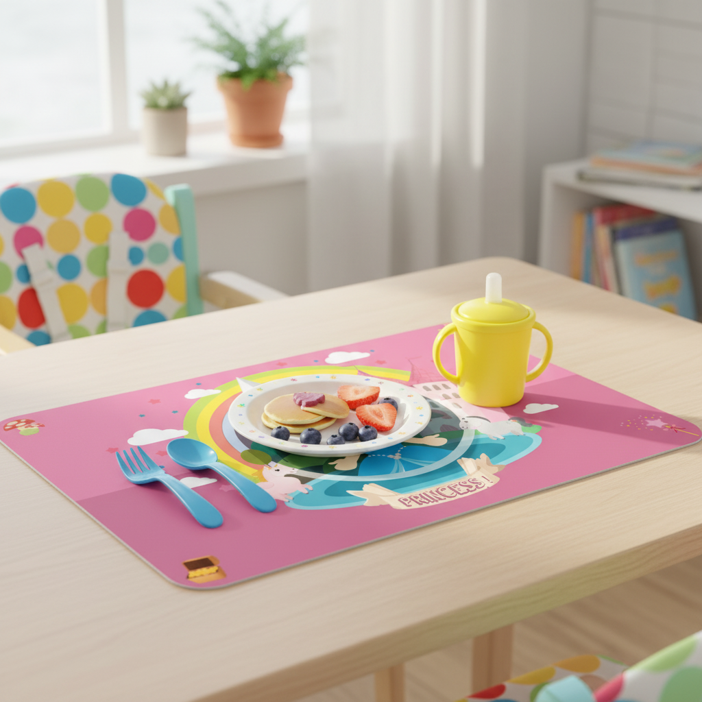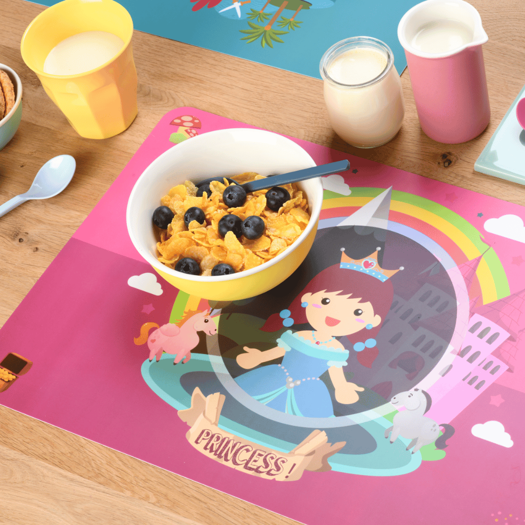 Søt bordbrikke til barn i rosa med motiv av prinsesse. På bordbrikken står det skrevet "princess"