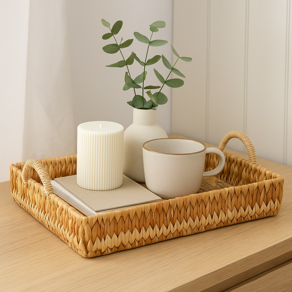Bruk det til å samle småting på kjøkkenbenken, servere kaffe på stuebordet eller som base for dekor med lys og planter. Det solide flettverket gjør brettet både praktisk og dekorativt, og passer inn i alt fra moderne til mer klassiske hjem.