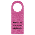 Kort til å henge på vinflasken i rosa glitter med teksten "Perfekt til jentekveld og skravling" i sort.