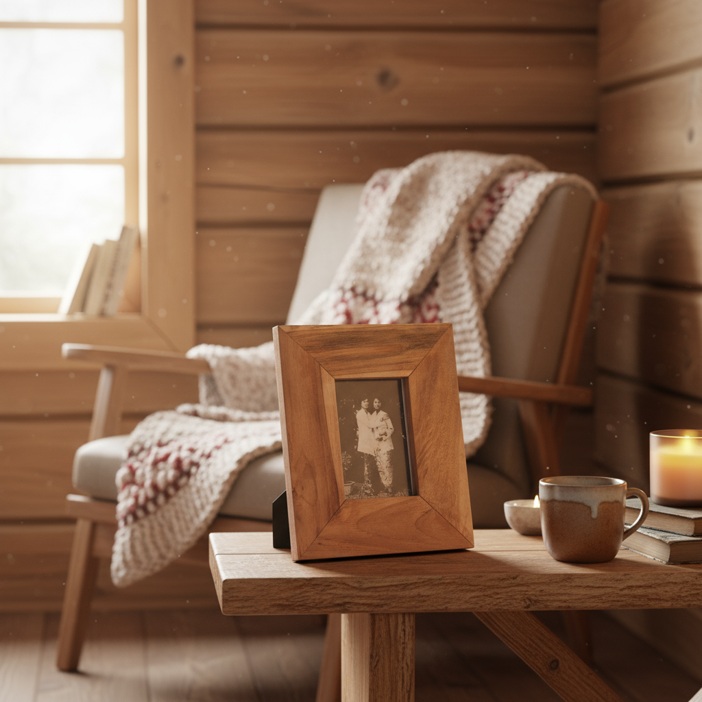 Den solide trerammen fremhever bildet på en harmonisk måte, og passer like godt til familiebilder som naturmotiver.