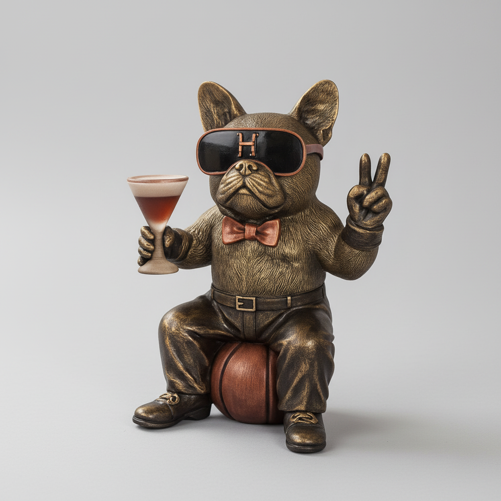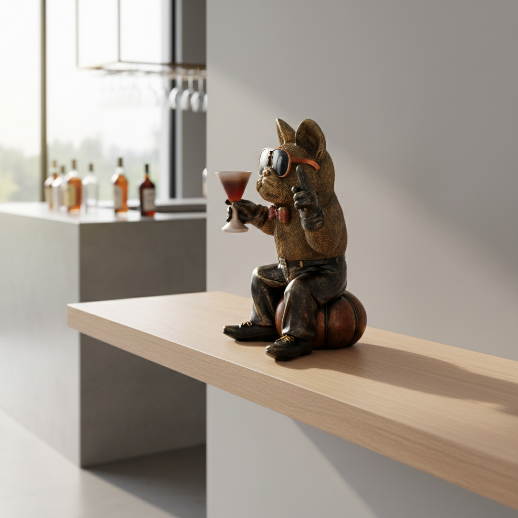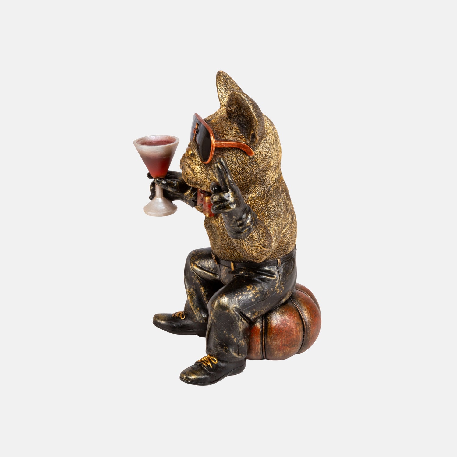 Figuren er laget i polyresin og har en bronsefarget overflate med håndmalte detaljer som gir et levende uttrykk. Plasser den på en hylle, et sidebord eller i barområdet for et artig blikkfang som garantert får folk til å trekke på smilebåndet.