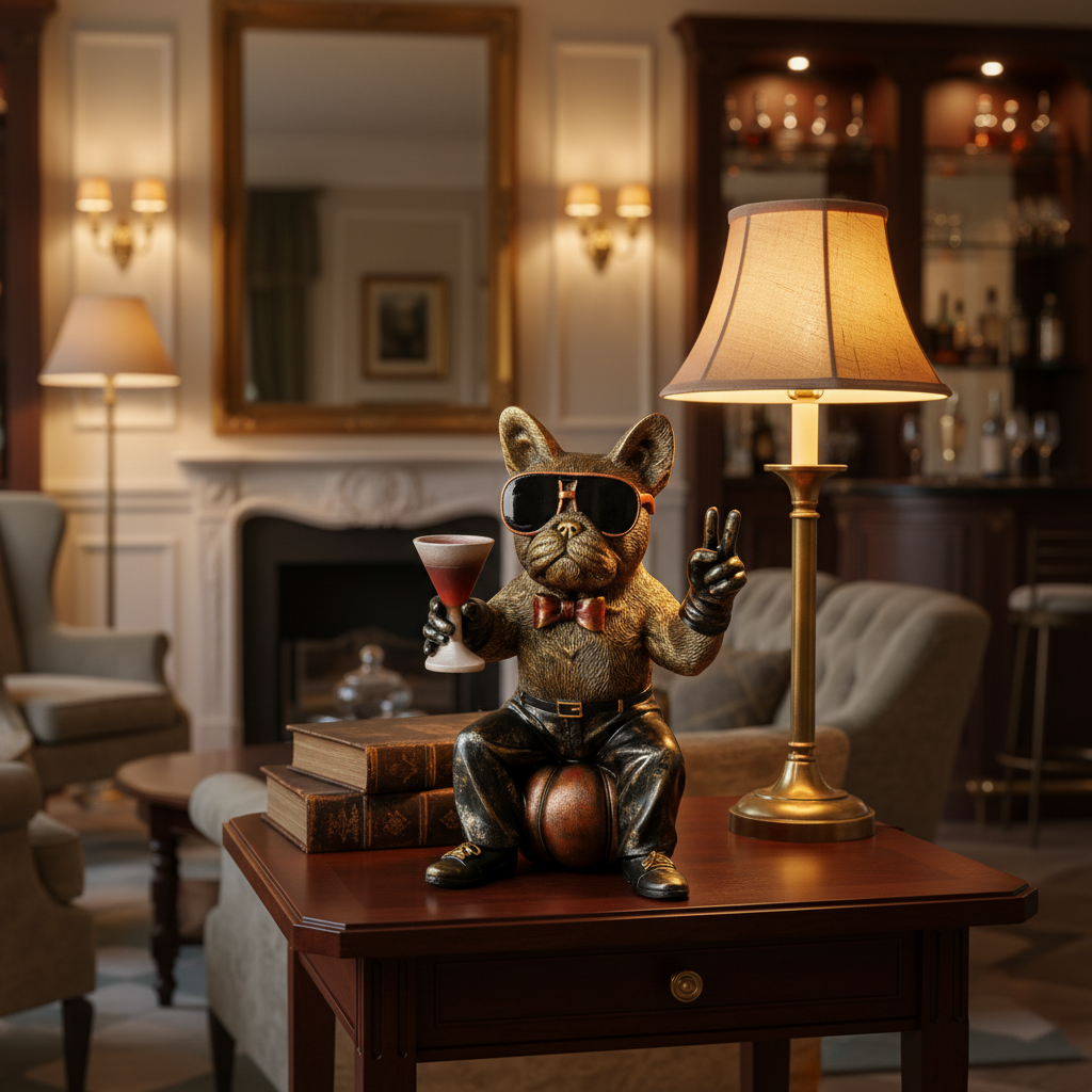 Hund party med glass er en detaljrik og uttrykksfull figur som skaper god stemning i rommet.