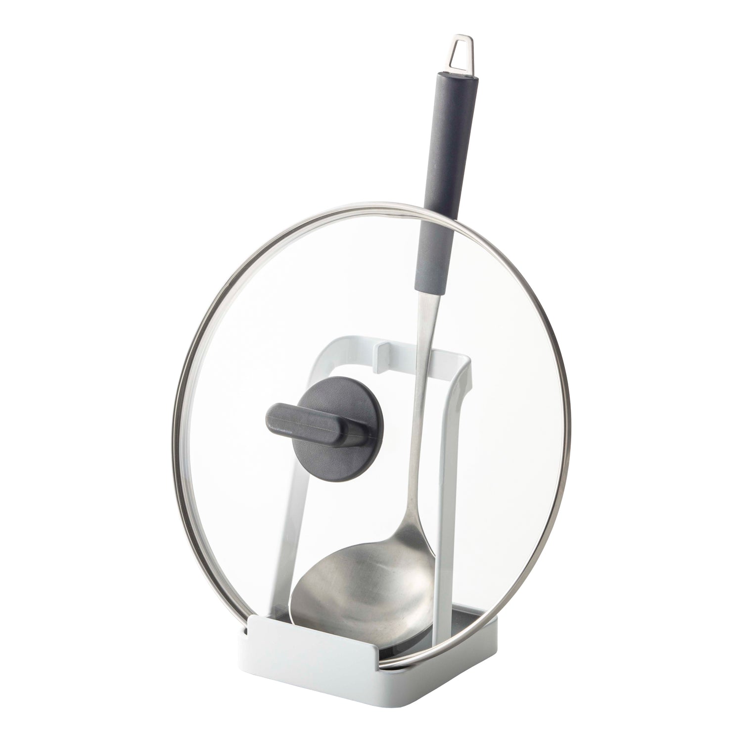 Et praktisk og plassbesparende hvitt stativ som holder kjøkkenredskaper, sleiver og lokk organisert på benken.