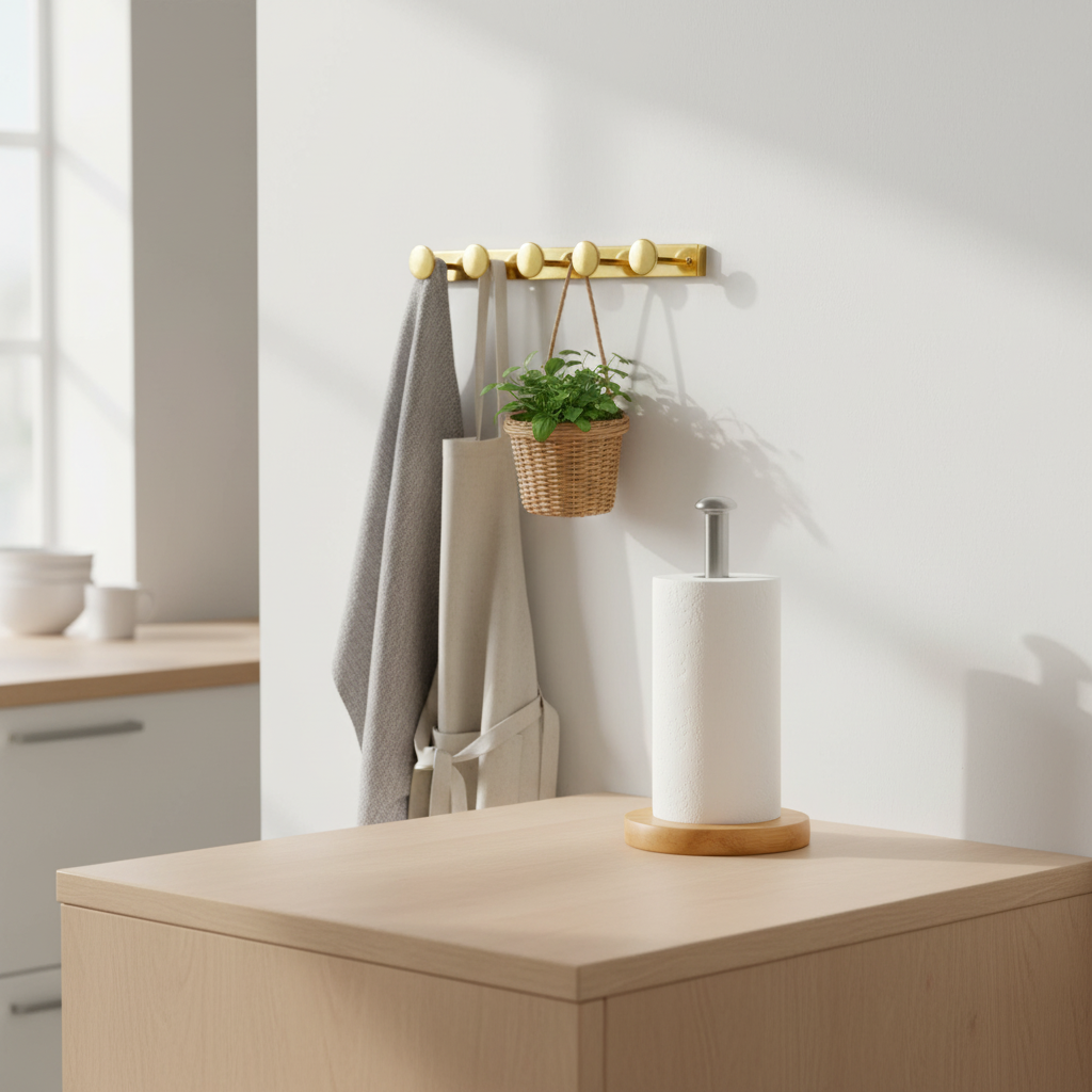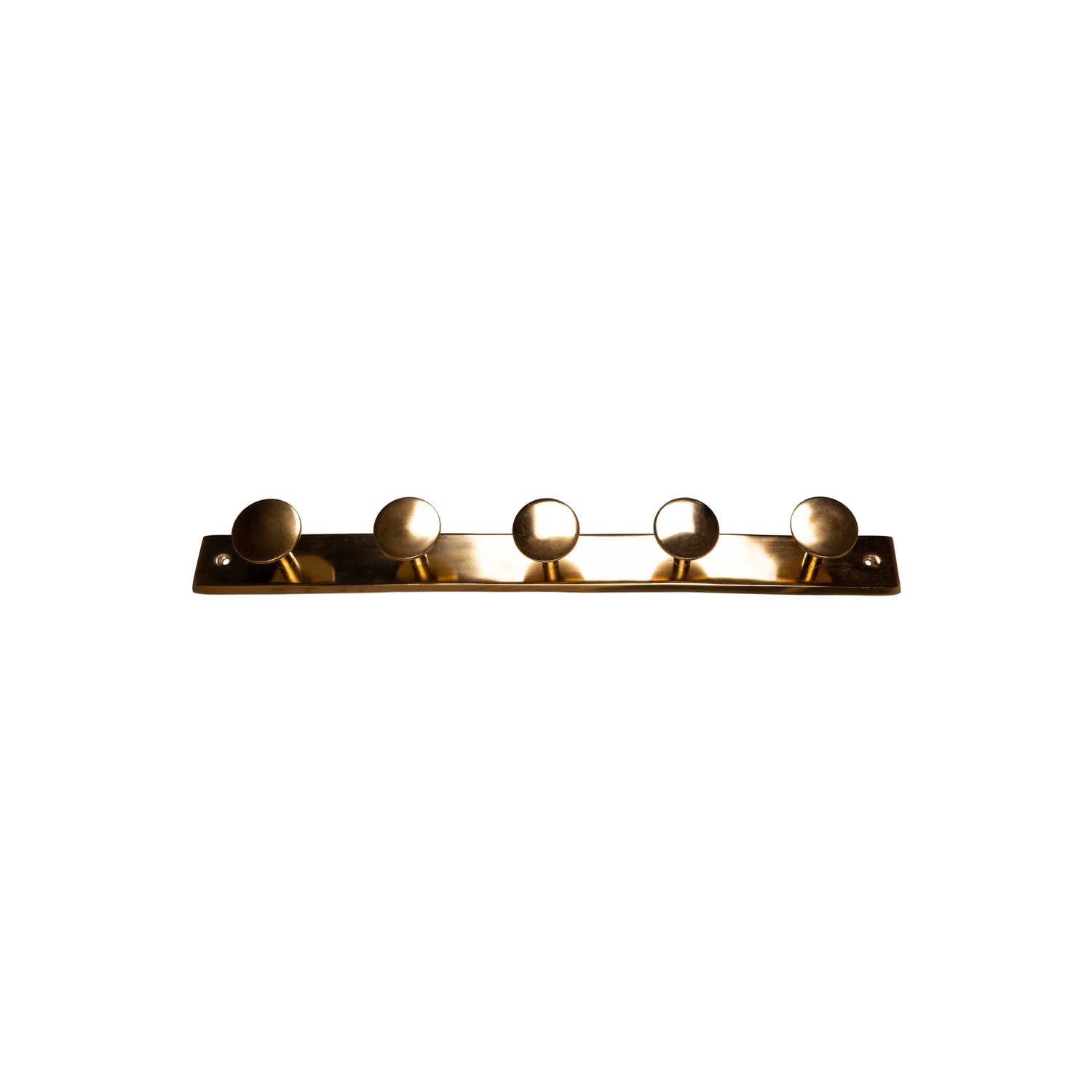 Praktisk og dekorativ knaggrekke i gullfarget metall med fem kroker. Perfekt til oppheng av jakker, håndklær, vesker eller smykker både i gang, bad og soverom.