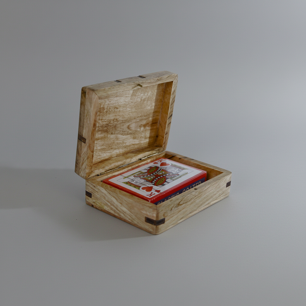 Denne kortesken er laget i tre og har et rustikt uttrykk som gir både varme og karakter. På lokket er det utskjært et kortmotiv. Esken rommer én standard kortstokk. Perfekt som pynt til hytta