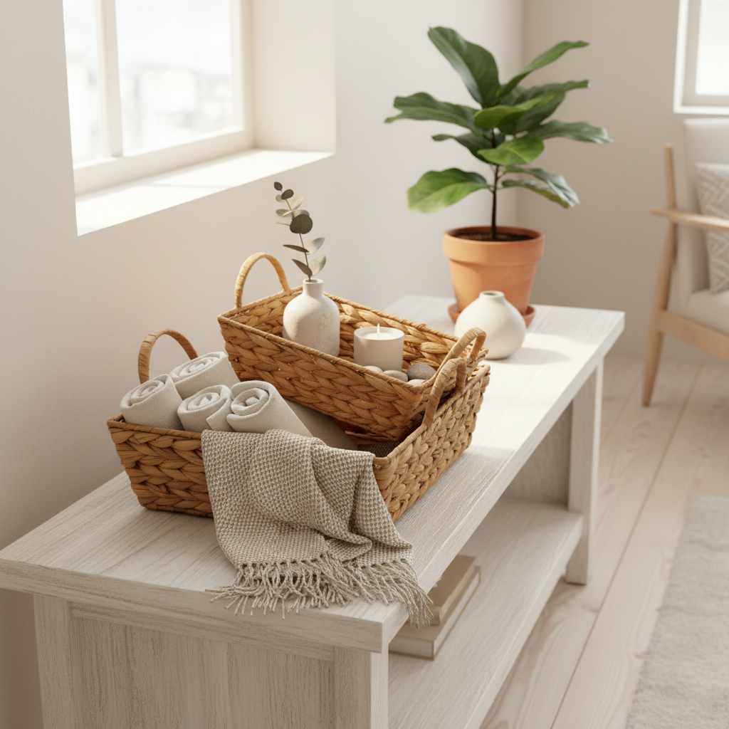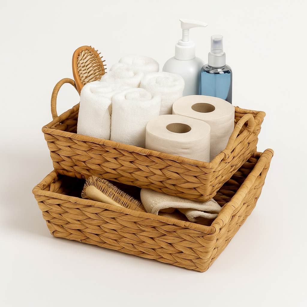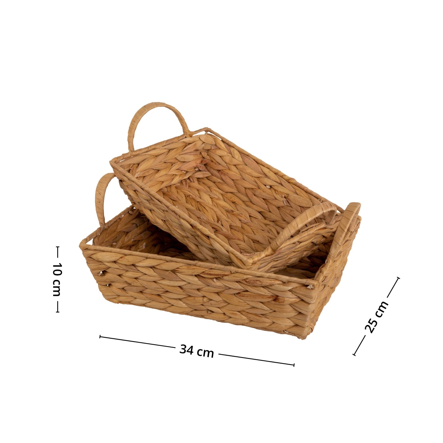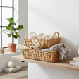 Oppgrader oppbevaringen din med dette settet bestående av to flettede kurver i rektangulær form. Kurvene kombinerer praktisk funksjon med et varmt og naturlig uttrykk som passer inn i de fleste hjem.