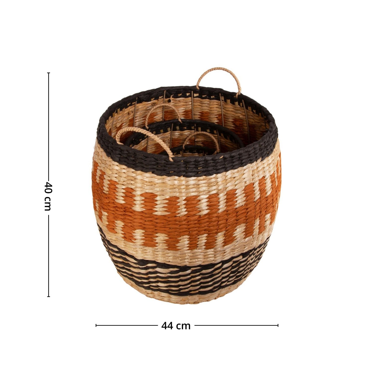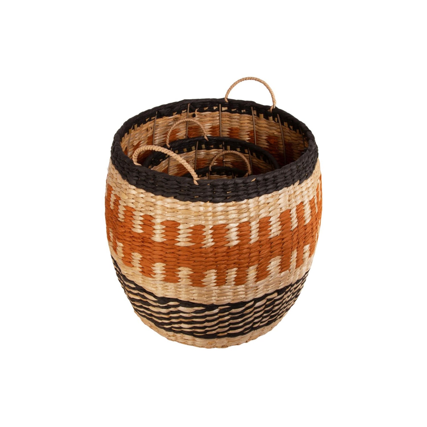 Dette flettede kurvsettet består av tre vakre kurver i naturlig materiale med et dekorativt brunlig mønster.