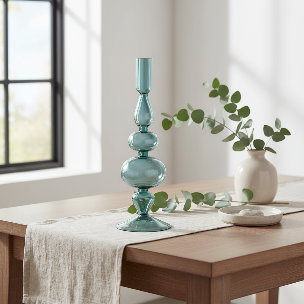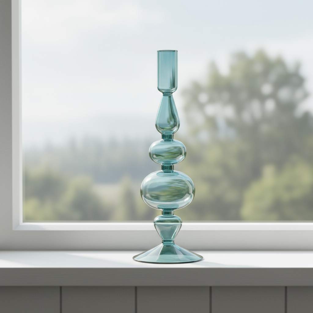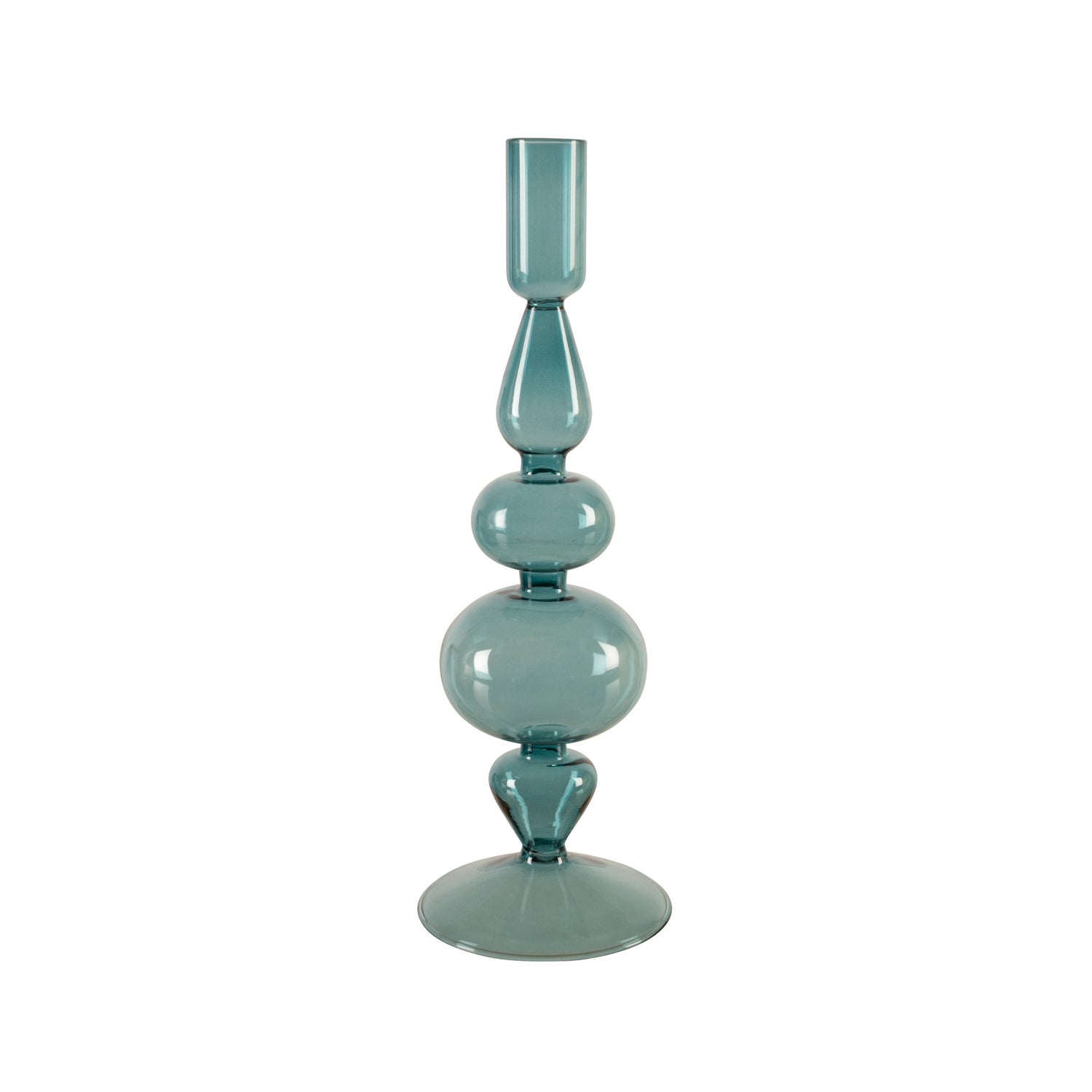 Høy lysestake i blått glass med moderne form og dekorativ glans. Denne lysestaken er laget av klart glass som fanger lyset på en vakker måte, og gir et rolig og stemningsfullt uttrykk.