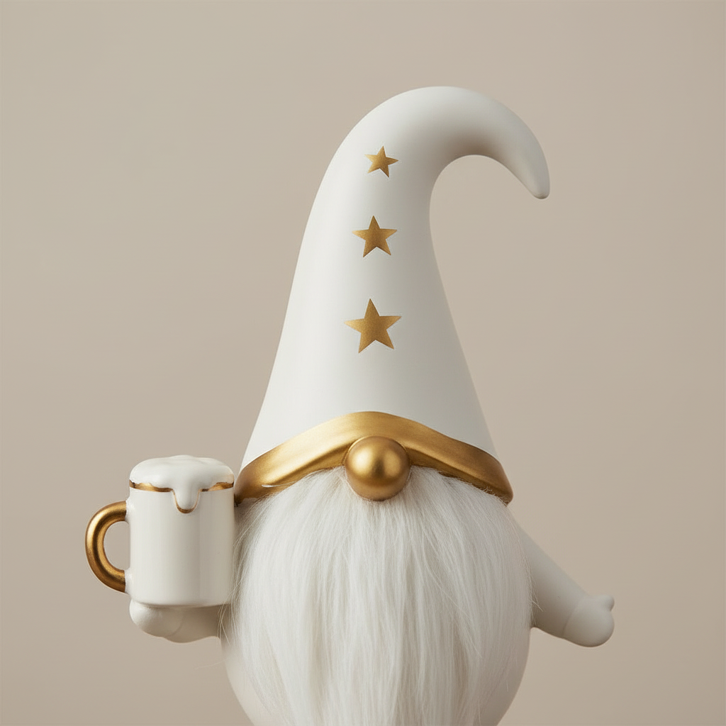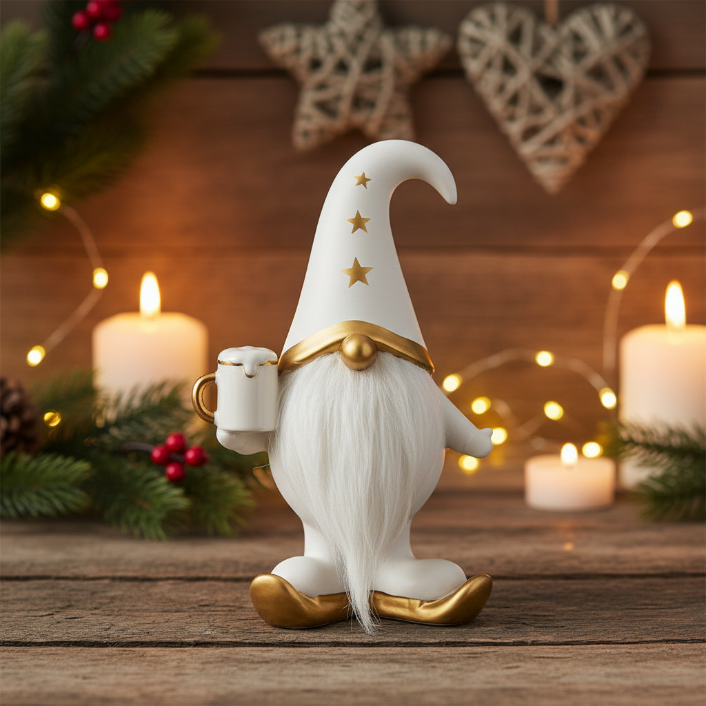 Lekker nissefigur i hvitt og gull laget i slitesterkt keramikk. Den moderne designen kombinert med klassiske detaljer gjør denne figuren til et perfekt innslag i juledekorasjonen.