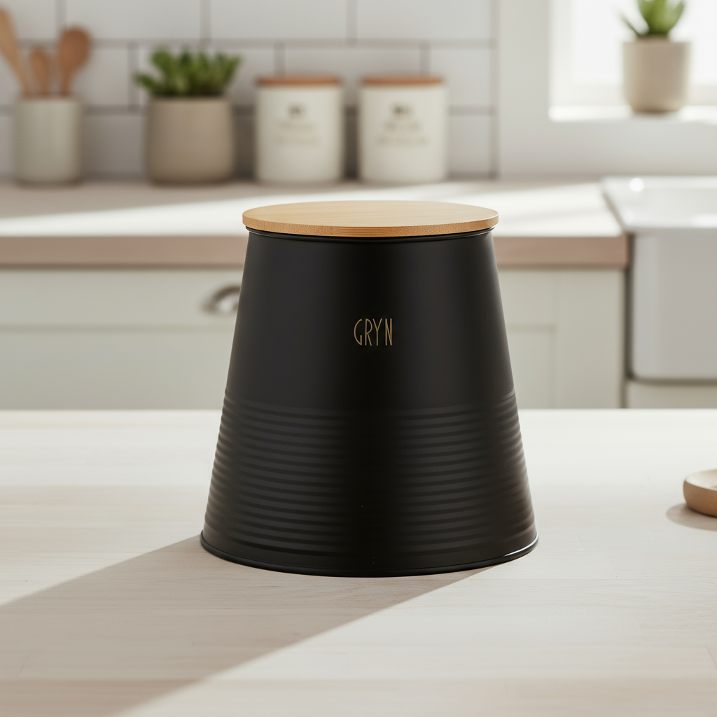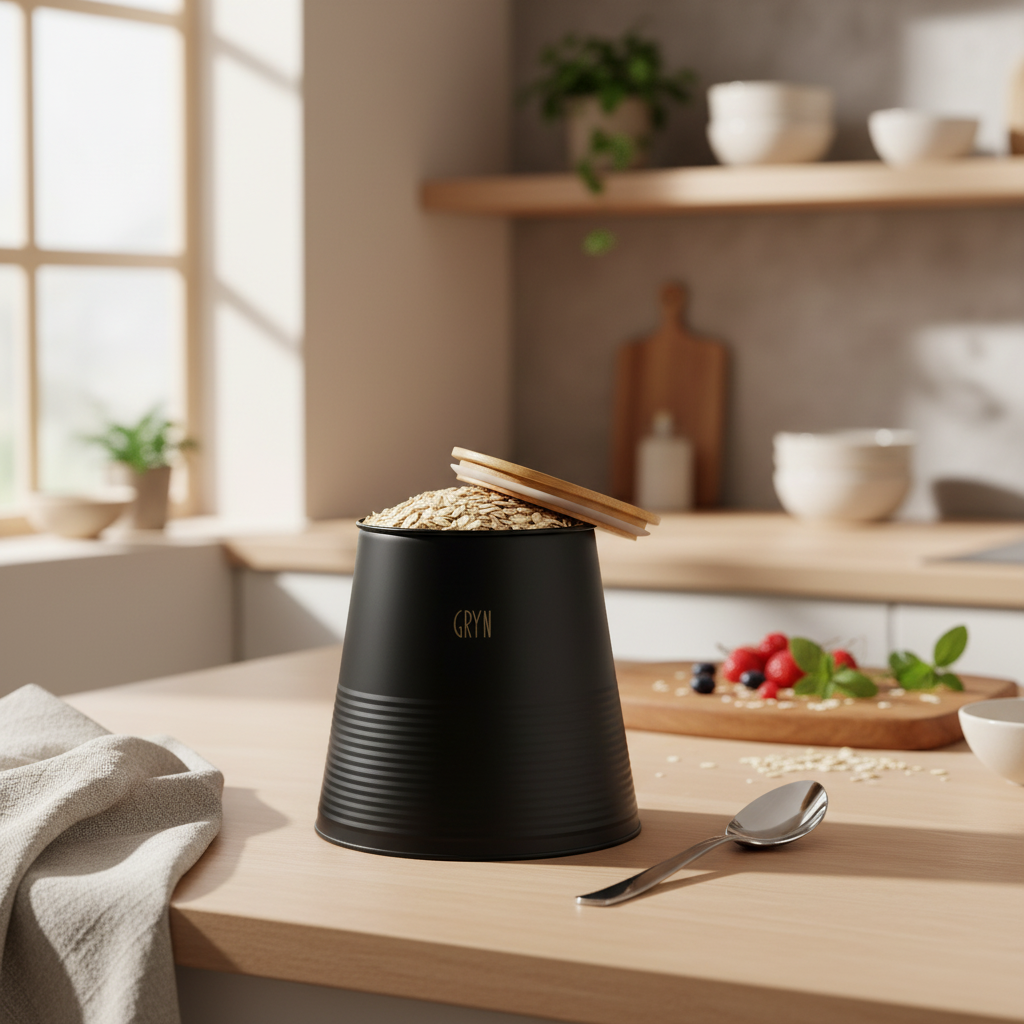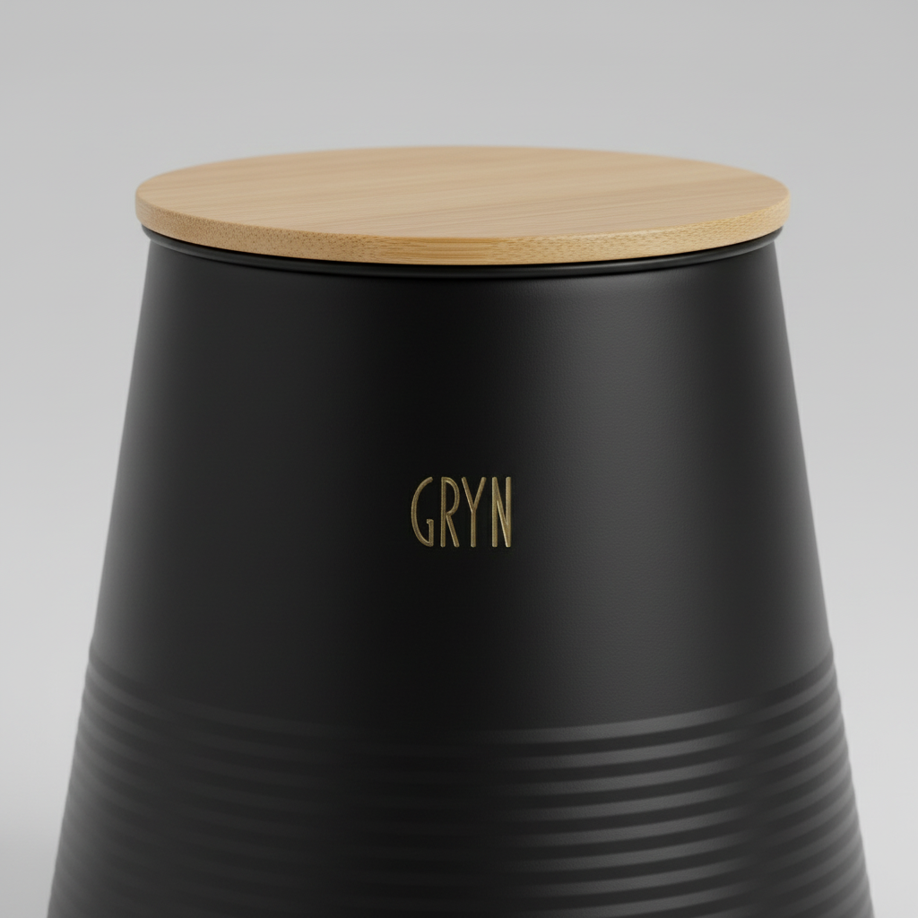 Inskripsjonen GRYN i gull gjør det enkelt å skille boksen fra andre matvarer og gir samtidig et dekorativt preg på kjøkkenbenken eller i skapet. Perfekt for havregryn, quinoa, couscous, ris og andre tørre matvarer du ønsker oversikt over.