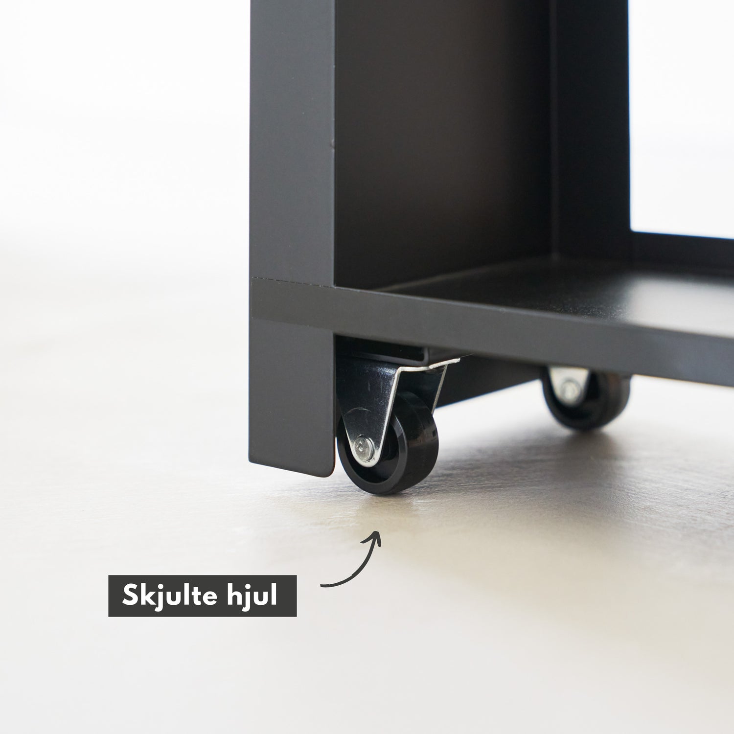 Med sine skjulte hjul og smale form passer den godt på små bad, vaskerom eller kontorer der gulvplass er begrenset.
