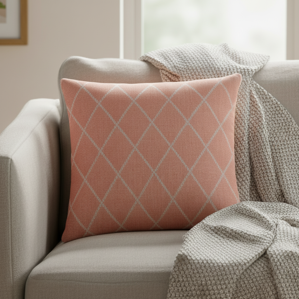 Kvadratisk bilde av rosafarget putetrekk i jacquard bomull