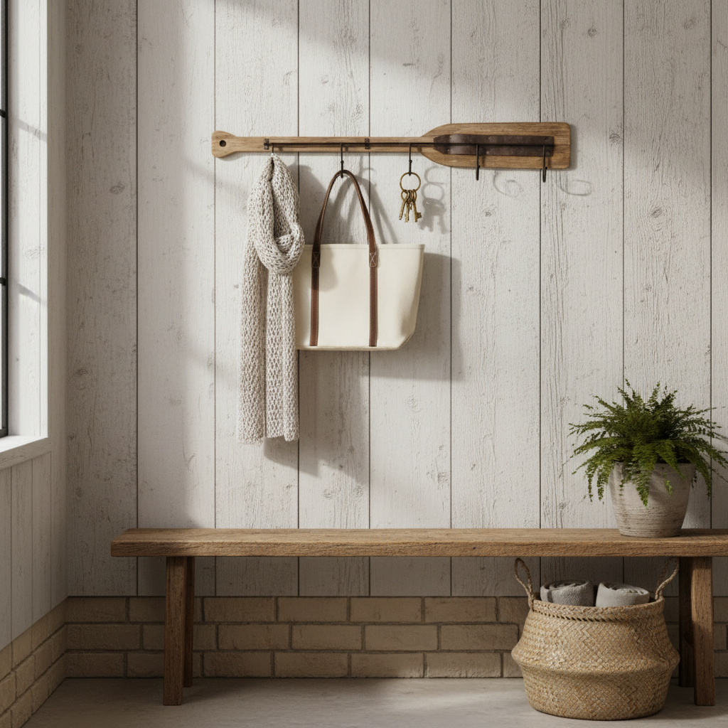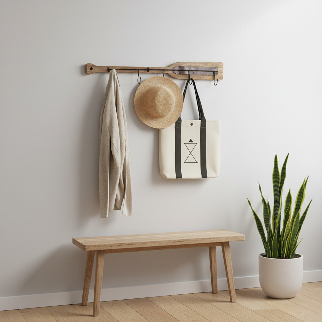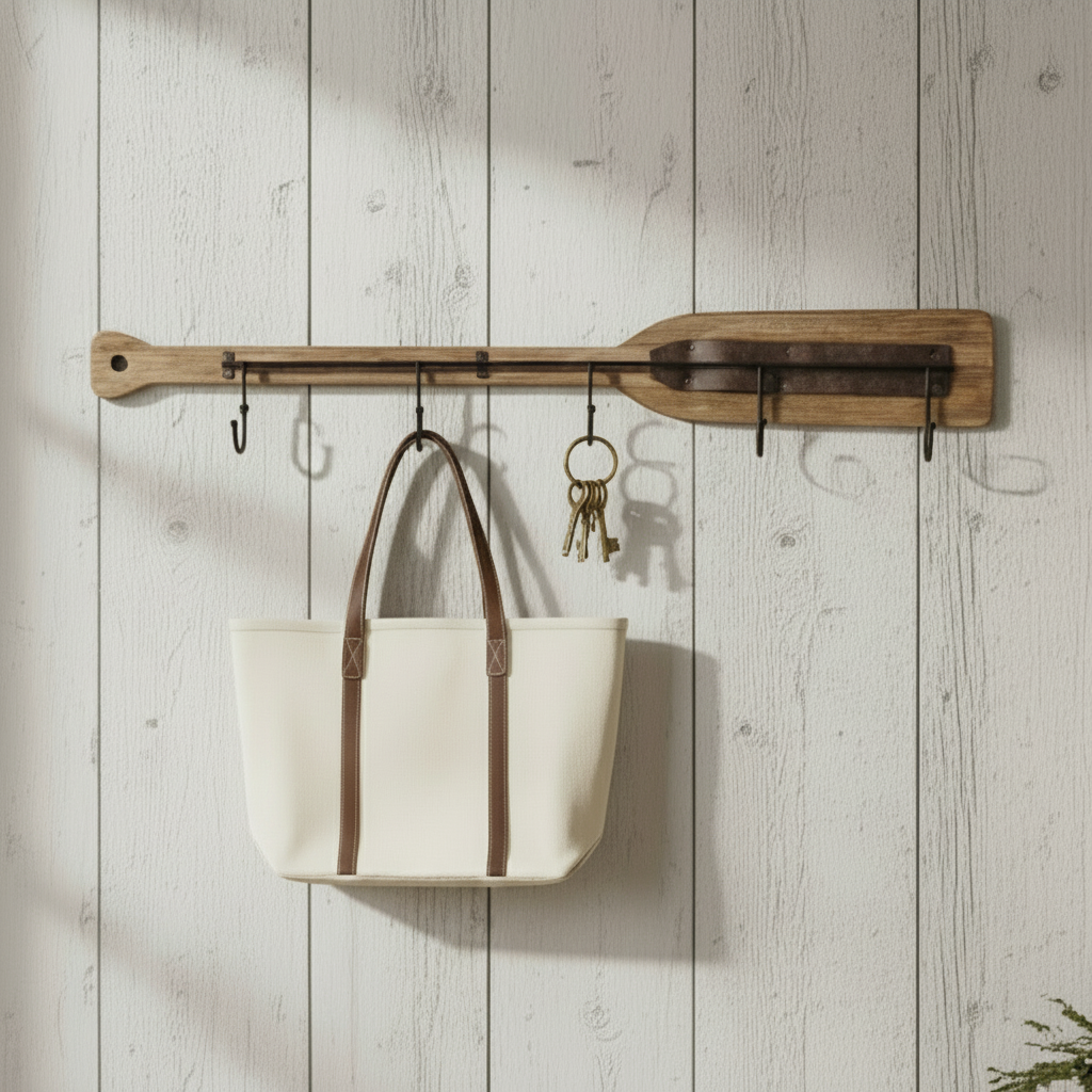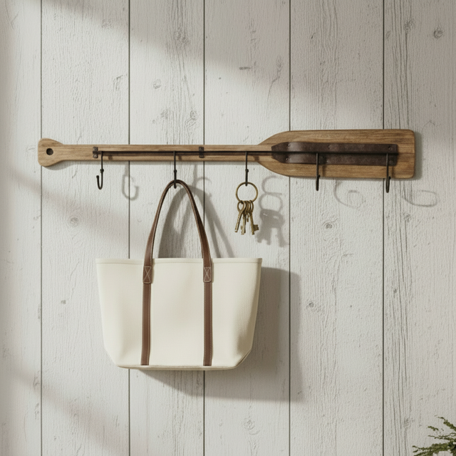 Denne knaggrekken formet som en åre kombinerer rustikt treverk med metallkroker, og gir et maritimt preg til gangen, kjøkkenet, badet eller hytta. Med fem solide kroker får du god plass til å henge opp jakker når du får besøk.