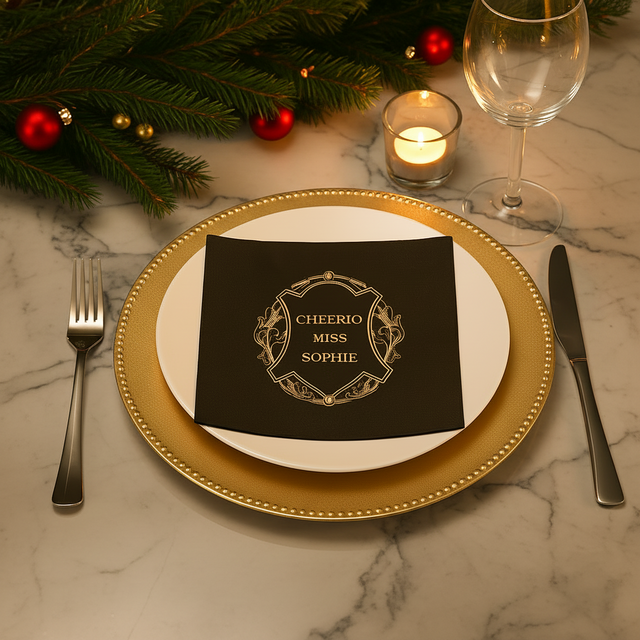 Denne elegante servietten i sort med gulltekst gir et luksuriøst og humoristisk preg på enhver borddekking. Teksten "Cheerio Miss Sophie" er en referanse til den klassiske nyttårssketsjen "Grevinnen og hovmesteren" og skaper en morsom og nostalgisk stemning blant gjestene.