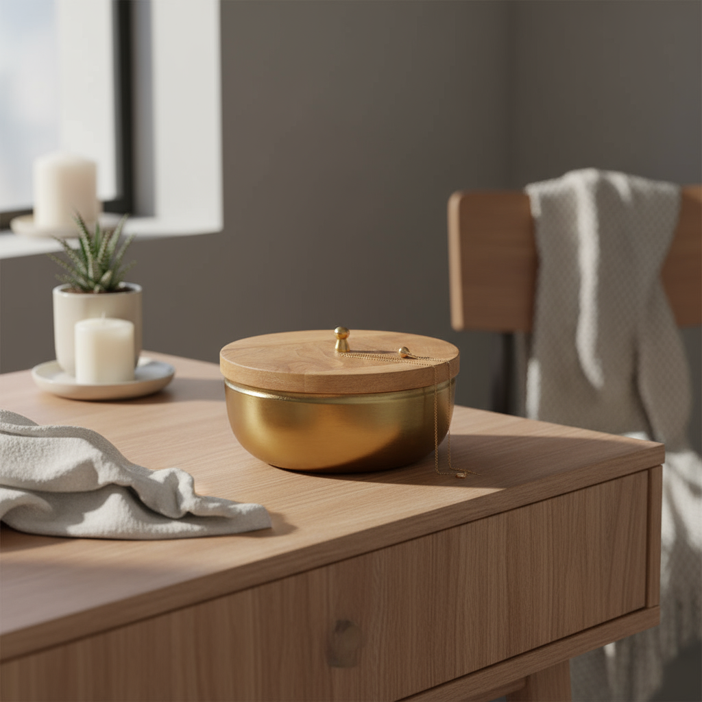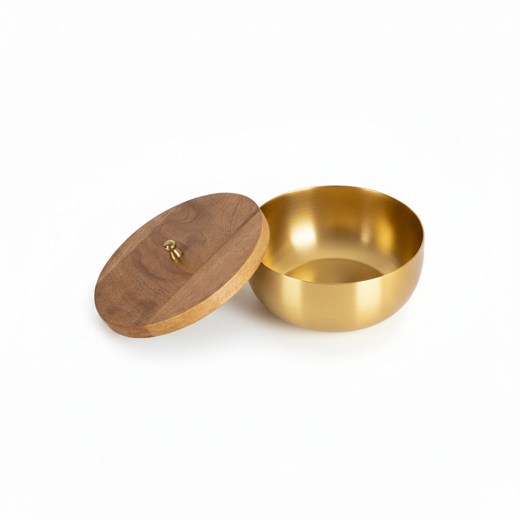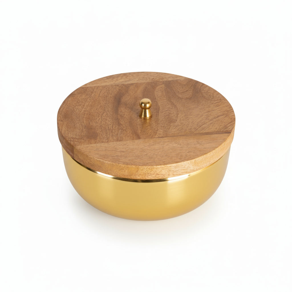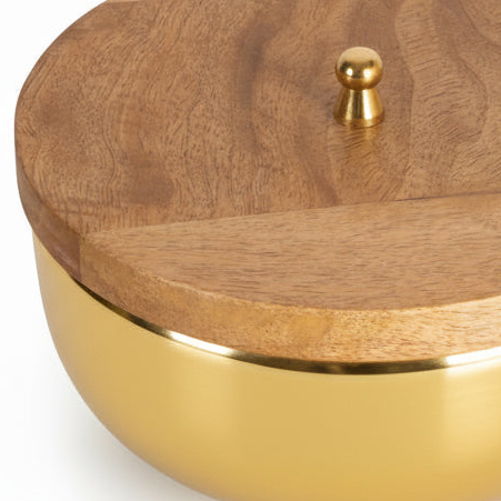 Dekorativ oppbevaringsskål i gullfarget metall med lokk i naturlig tre. En praktisk og vakker kombinasjon av varme og glans, perfekt til småting, smykker eller nøtter.