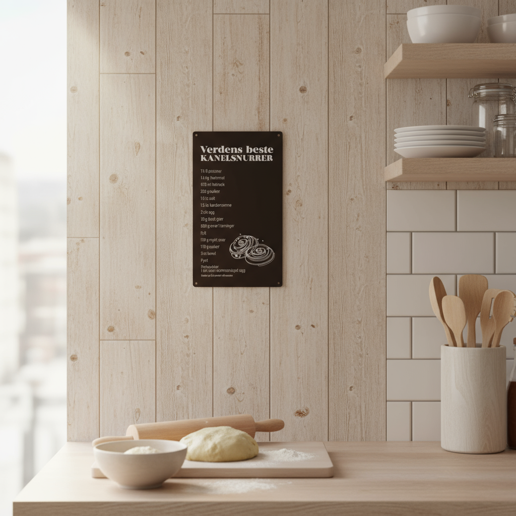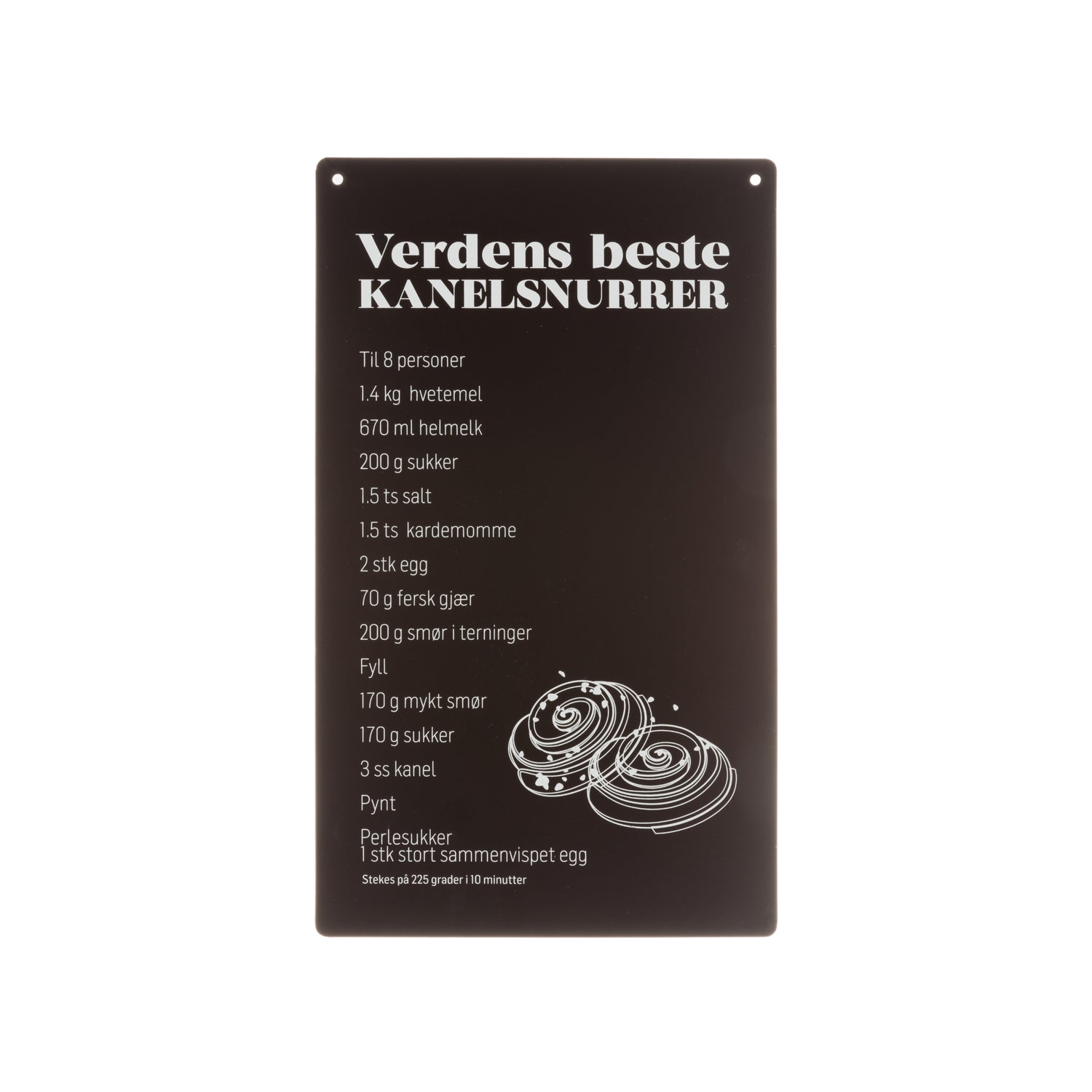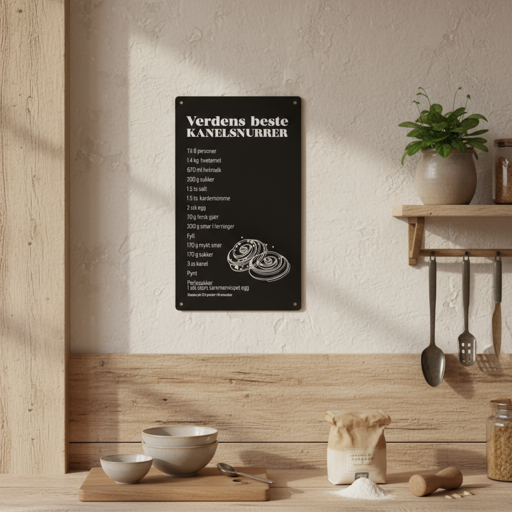 Dekorativt kjøkkenskilt i metall med oppskriften på deilige kanelsnurrer.