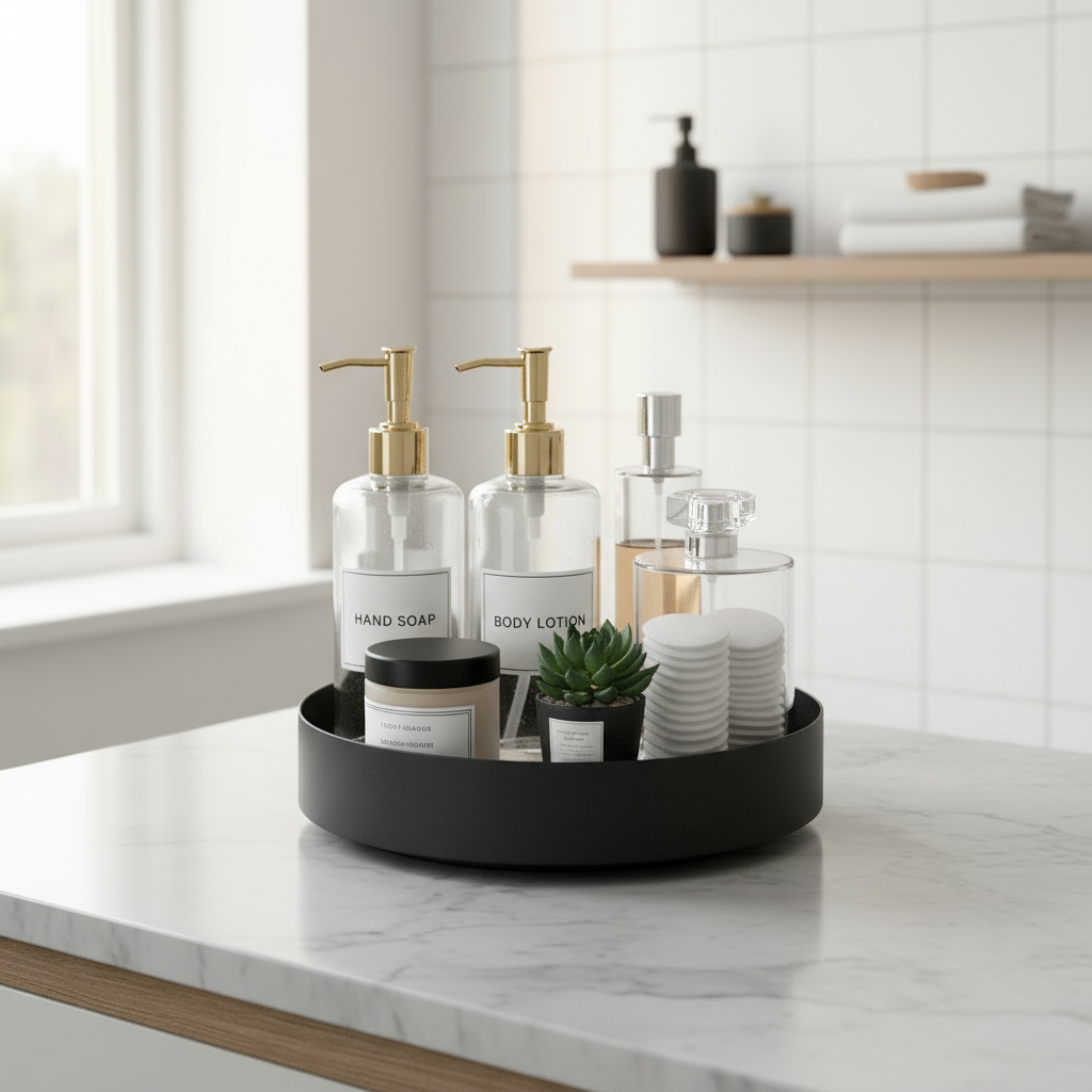 Praktisk snurrebrett i matt sort metall. Det snurrebrettet, også kalt "Lazy susan" er perfekt til å ha stående på kjøkkenbenken, badet eller i kjøleskapet. Få enkel tilgang til krydder, mat, bokser på kjøkkenet eller skjønnhetsprodukter, såper, hårprodukter på badet med dette praktiske brettet.