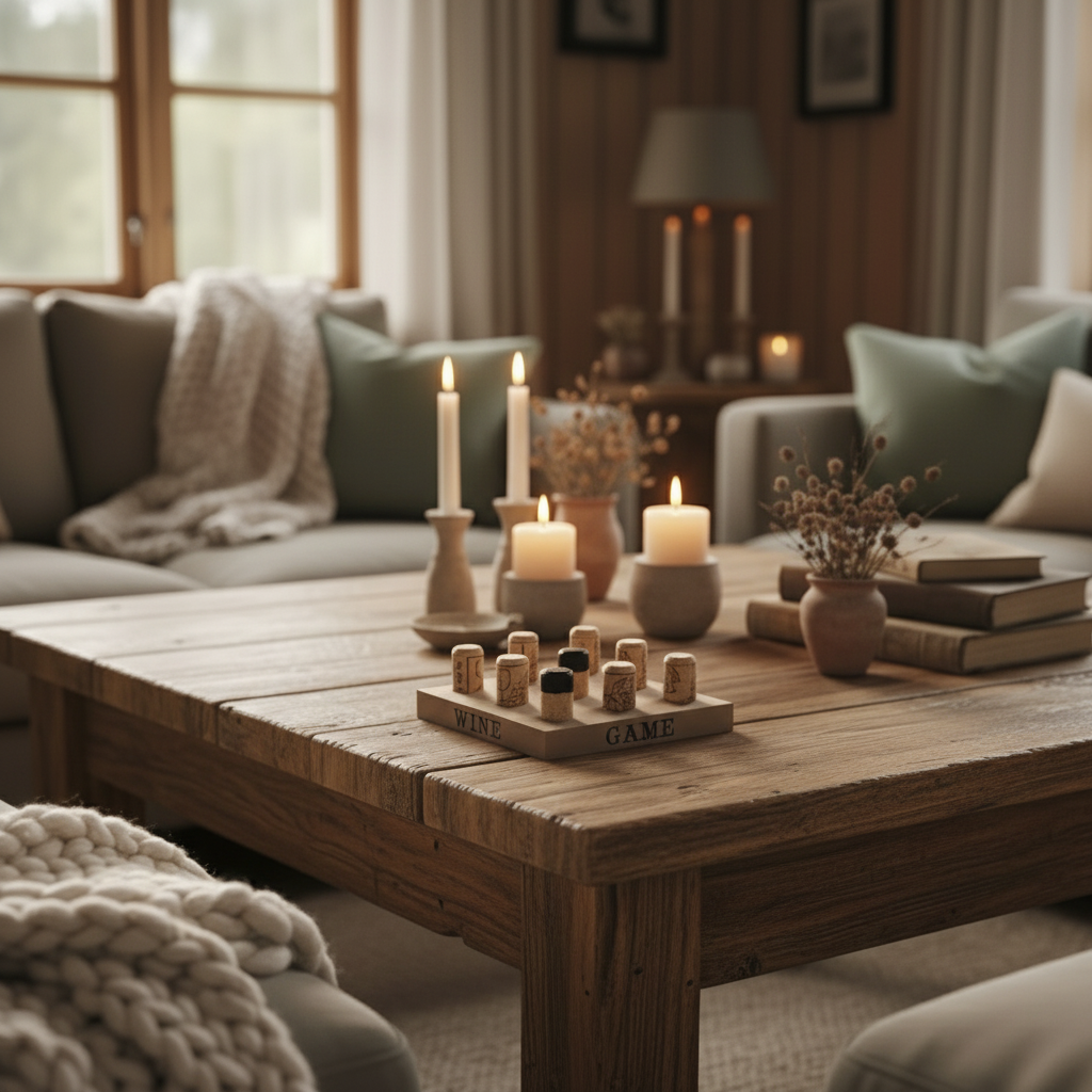 Spillsettet består av vinkorker som brukes som brikker til spillet og spillebrett. Spillet har et sjarmerende design som gjør at den er perfekt som pyntegjenstand hjemme eller på hytta.