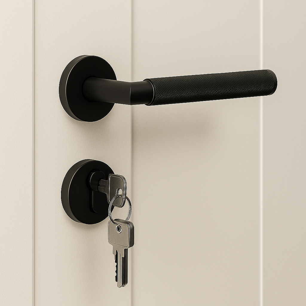 - Pakken inneholder: dørhåndtak, nøkkelskilt, låskasse, låsesylinder, nøkler, skruer
