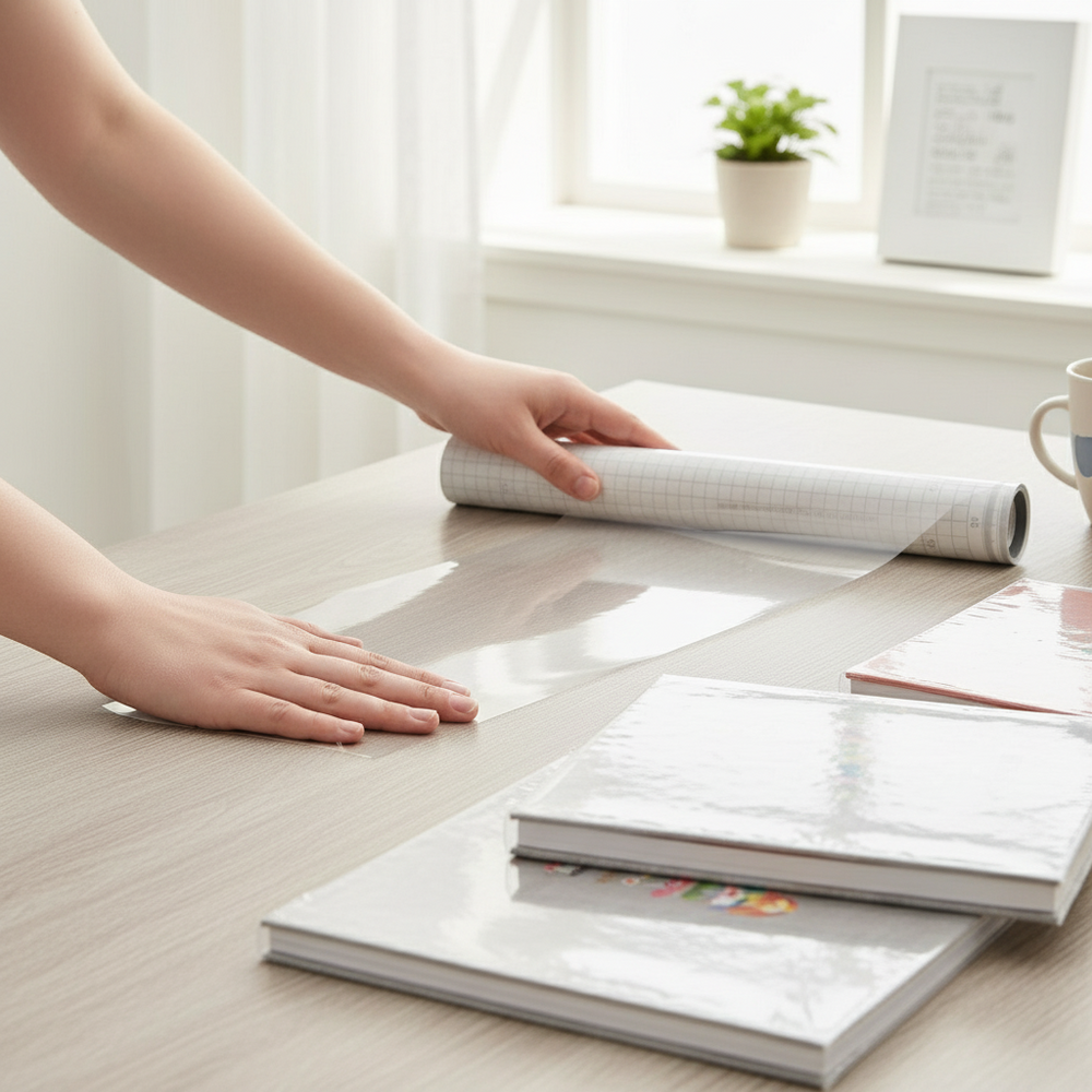 Transparent glossy kontaktplast er en populær gjennomsiktig folie som kan legges over de fleste slette flater som et beskyttelses-belegg.