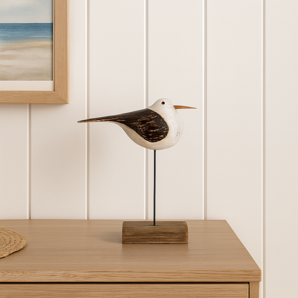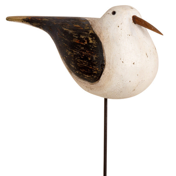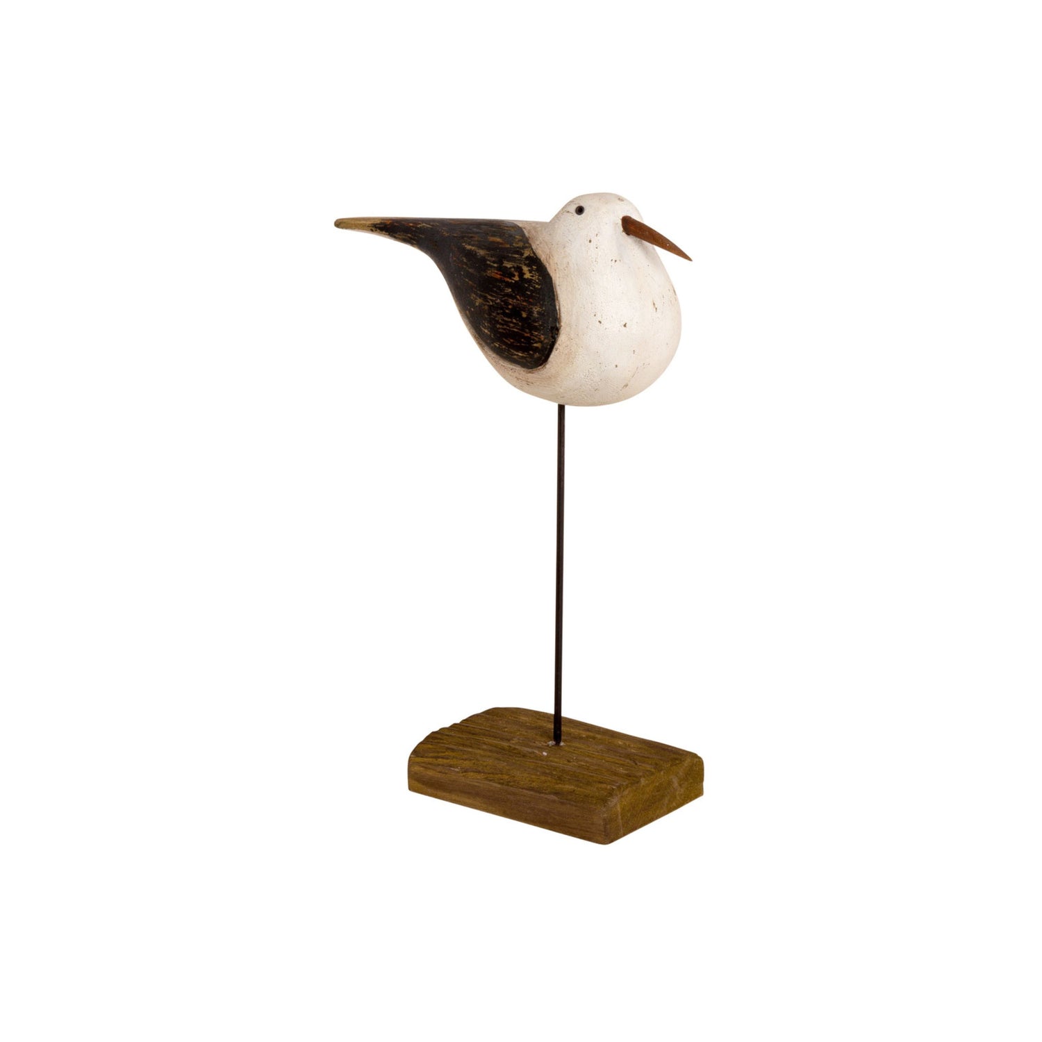 Dekorér hjemmet ditt med denne vakre måken i tre. En unik pyntegjenstand som gir et maritimt preg. Figuren er håndlaget i hvit og sort treverk, og står på en solid pinne festet i en rustikk trebase.