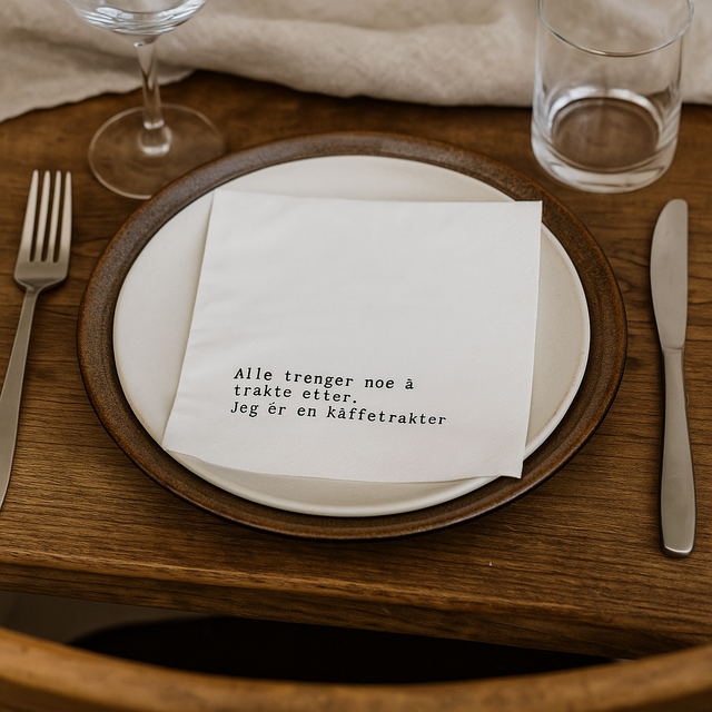 Morsomme servietter i hvit med teksten "Alle trenger noe å trakte etter, jeg er en kaffetrakter" i sort skrift. Serviettene er 3-lagspapir servietter og kommer med 20 stk i pakken.