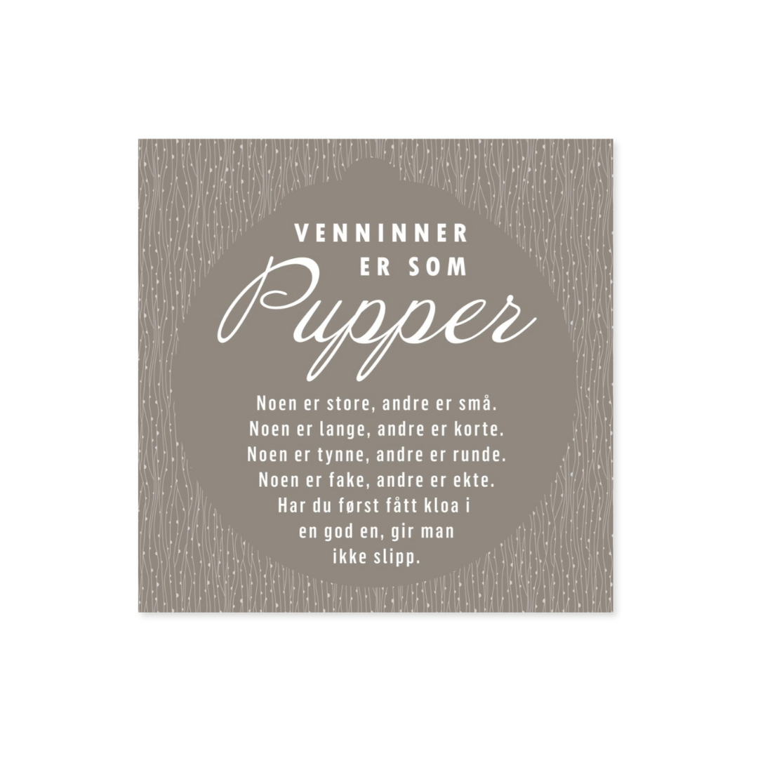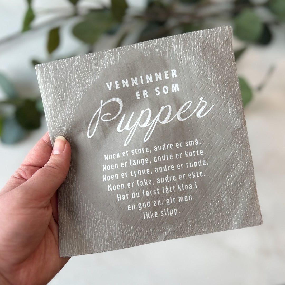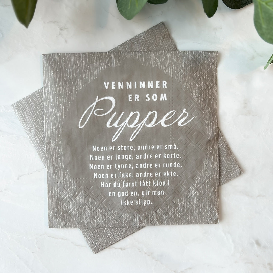 Stilfulle servietter i beige med morsom tekst "Venninner er som pupper" i hvit skrift. Perfekt til jentekvelder eller i gave til en venninne. Serviettene er 3-lagspapirservietter og kommer med 20 stk i en pakke.