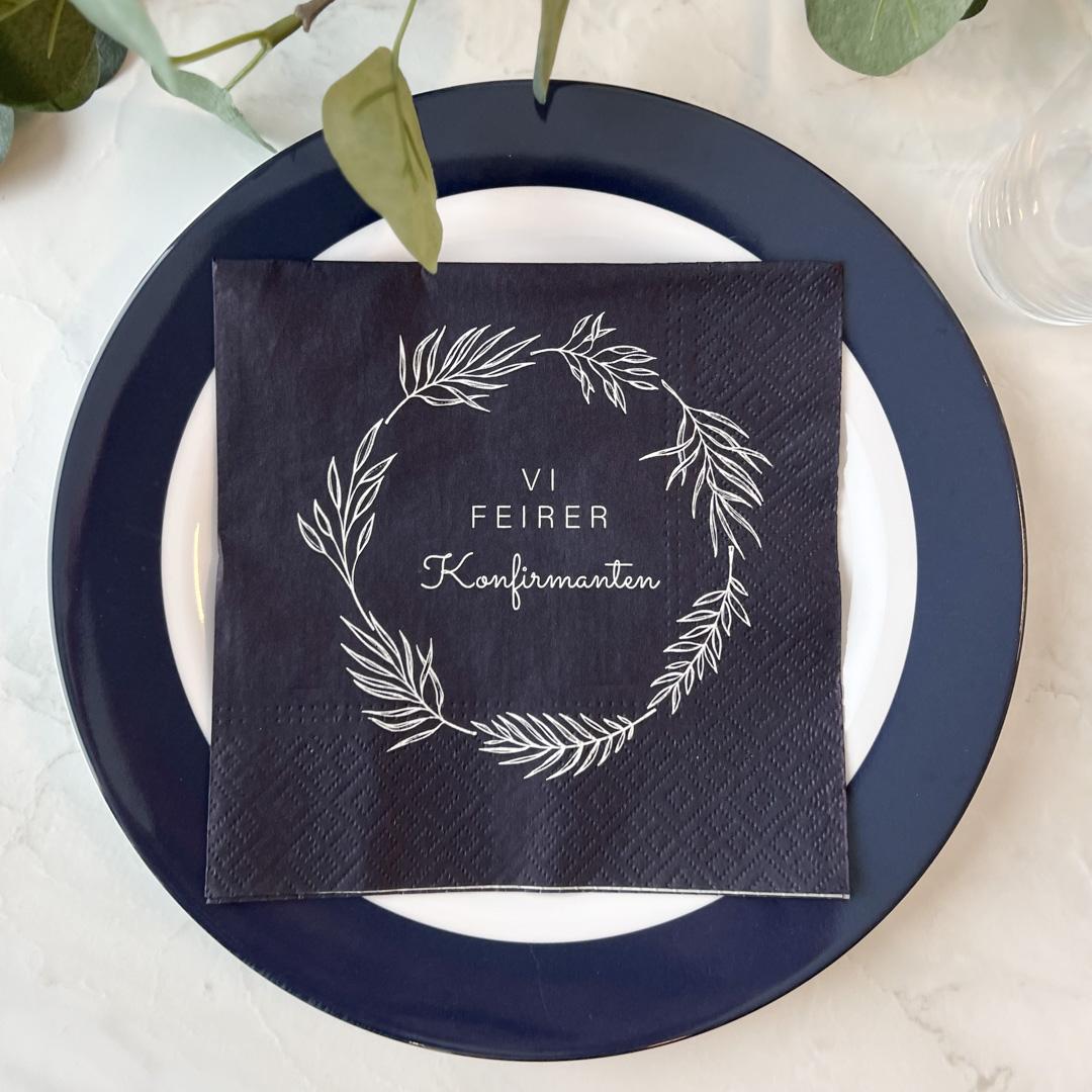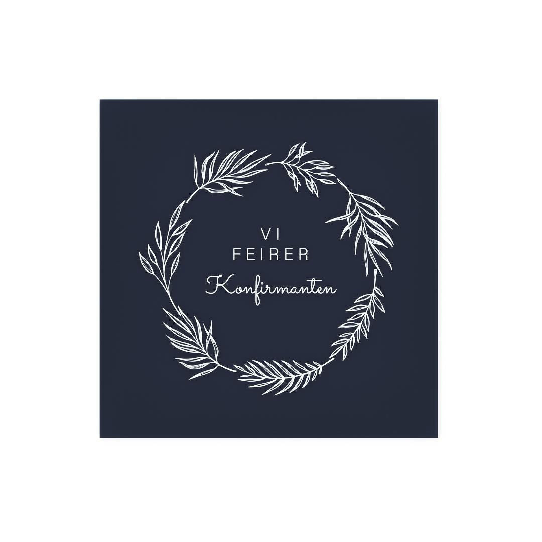 Stilfulle, mørkeblå servietter med teksten "Vi feirer konfirmanten". Serviettene er laget av 3-lagspapir og kommer i en pakke med 20 stk servietter. Perfekt til konfirmasjon til både gutt og jente.