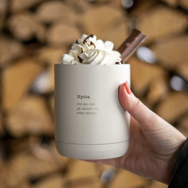 Kopp med teksten "Hytta – Her kan man gå udusjet i en sliten stilongs" gir et nostalgisk og humoristisk preg, perfekt for avslappede dager i fjell eller skog.
