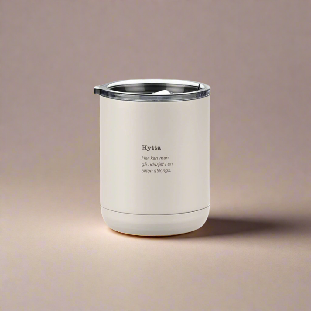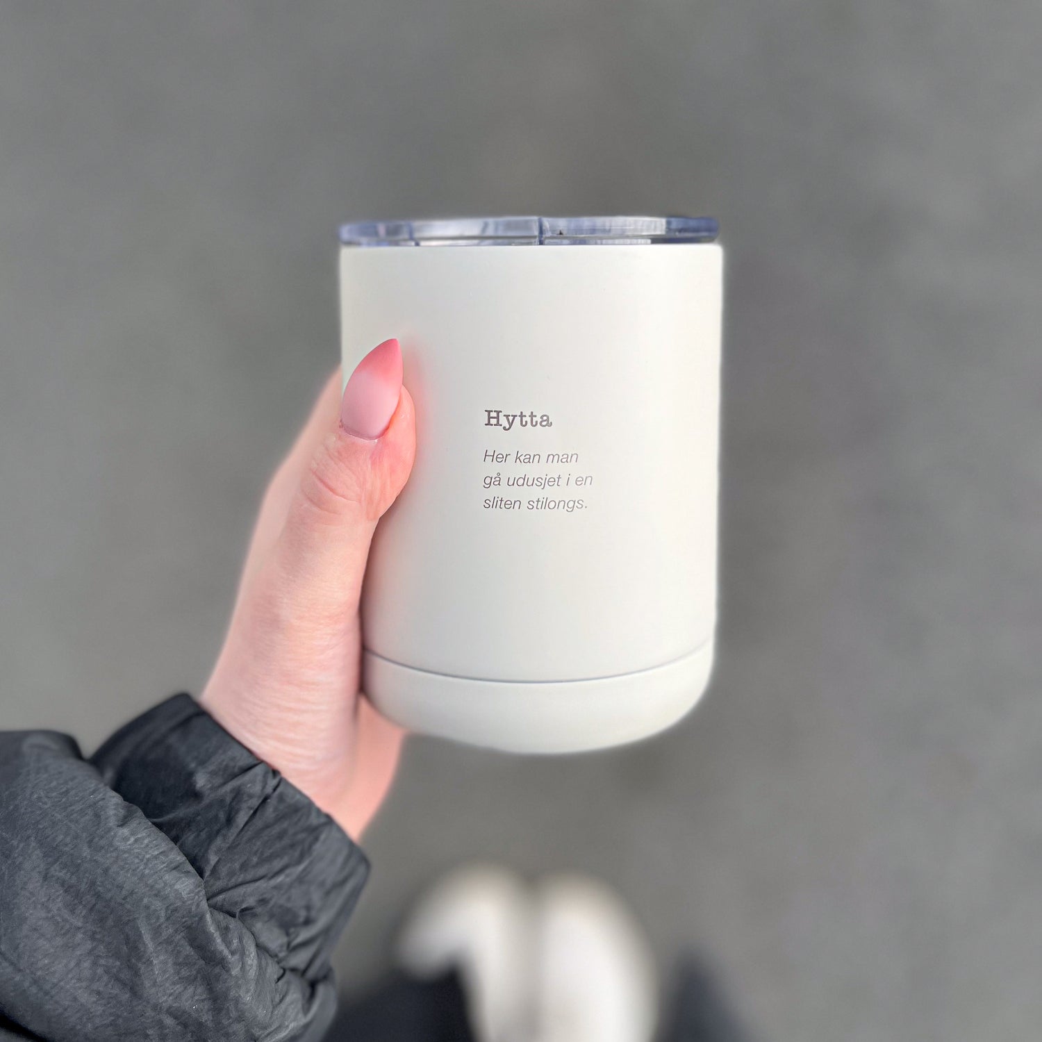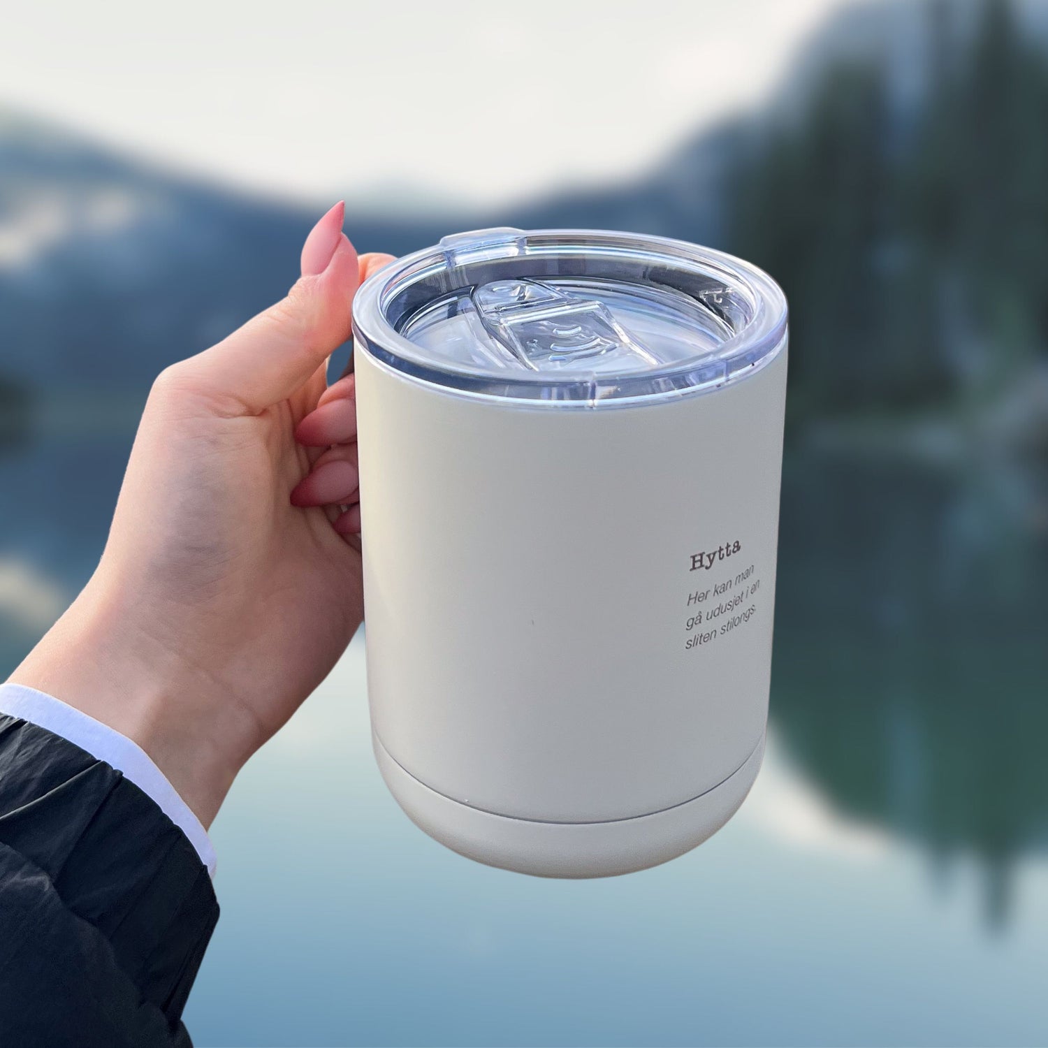 Hvit termokopp med lokk, designet for koselige hyttestunder.