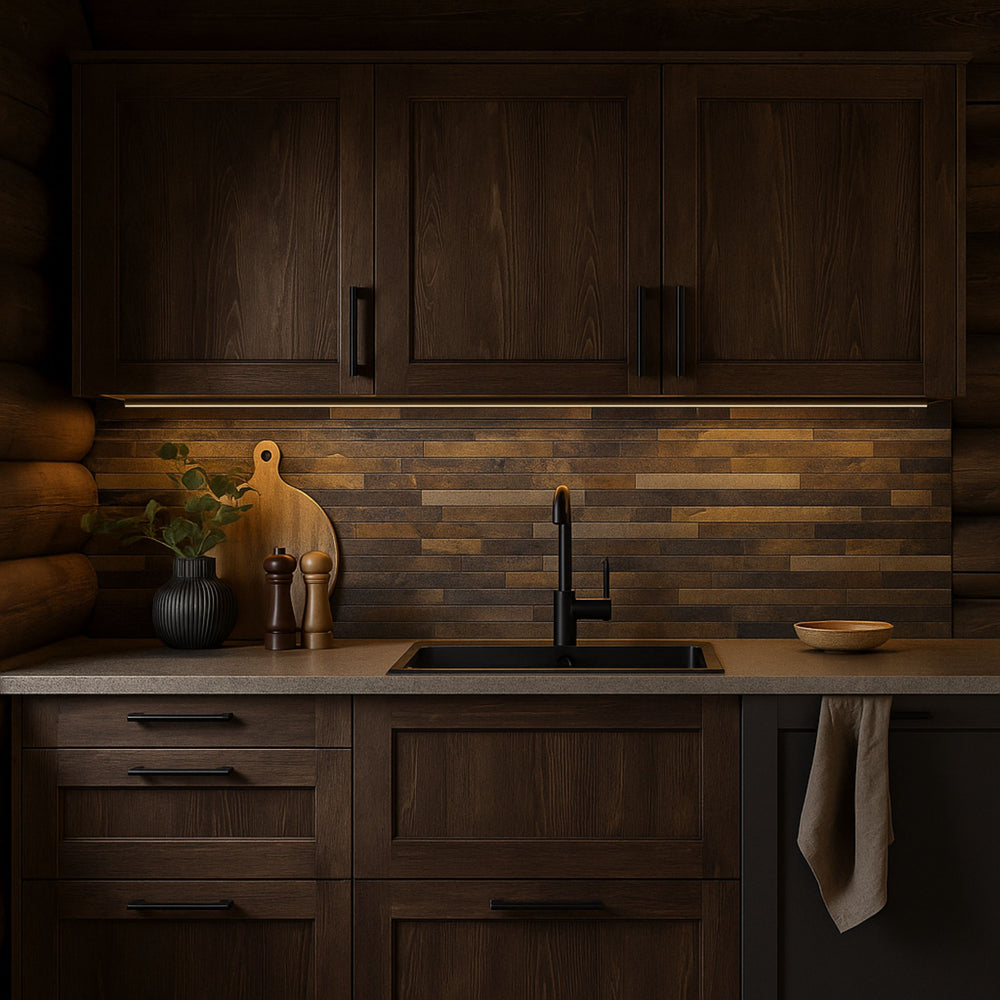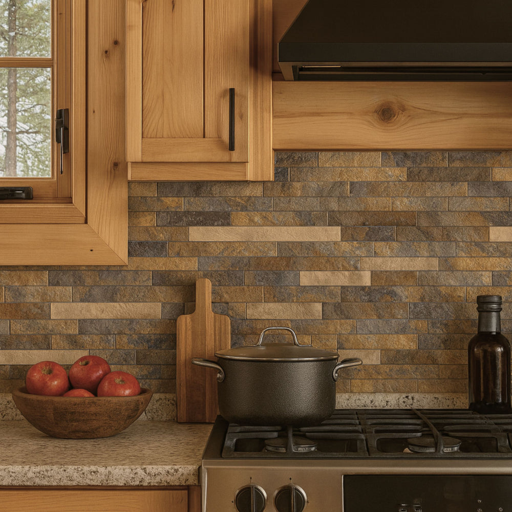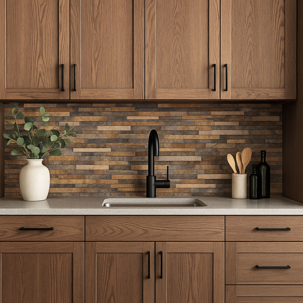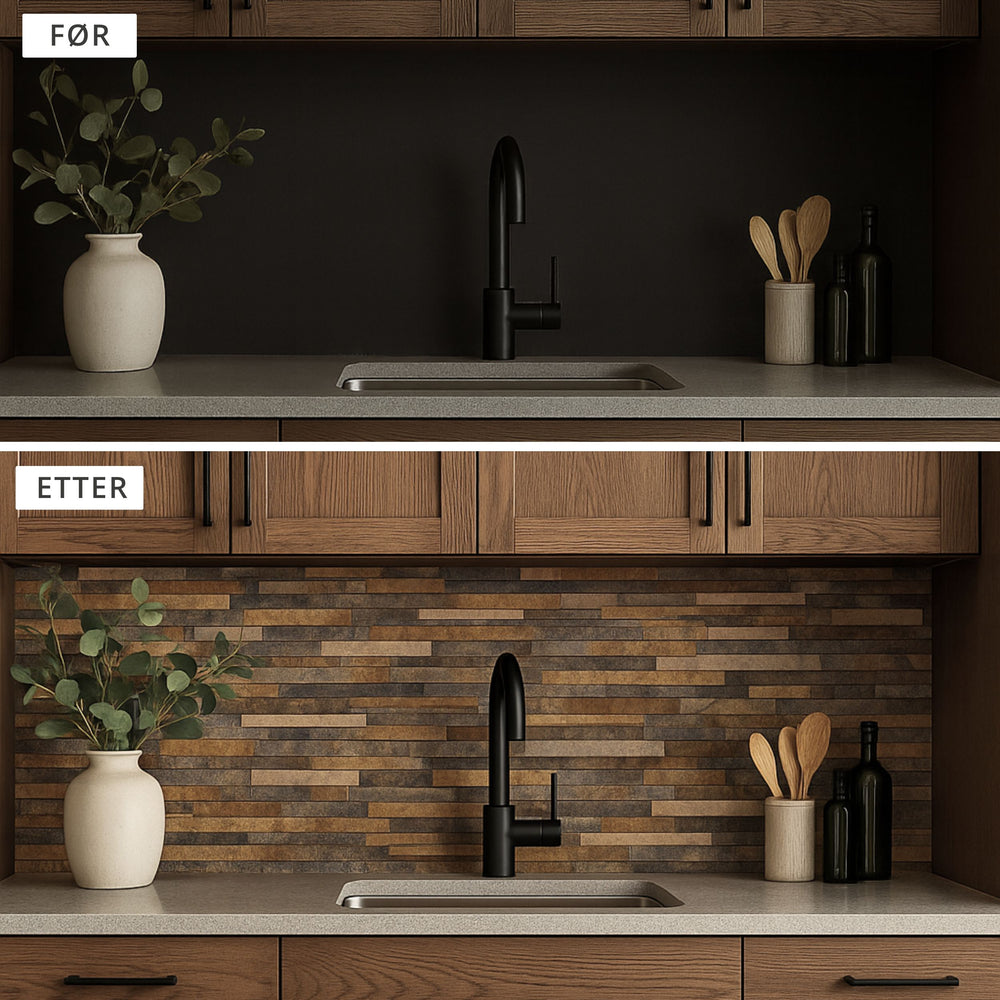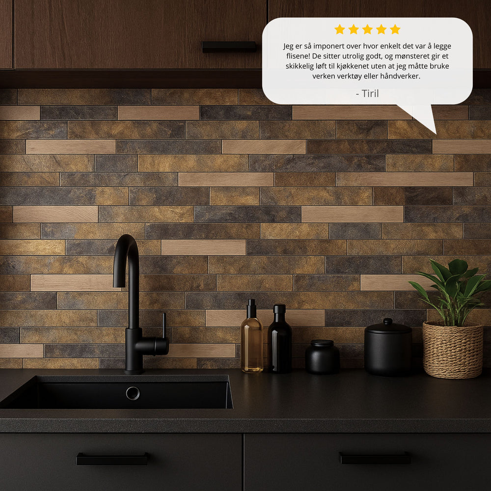 Moderne kjøkken med varme toner og Karoline selvklebende fliser i steinlook.