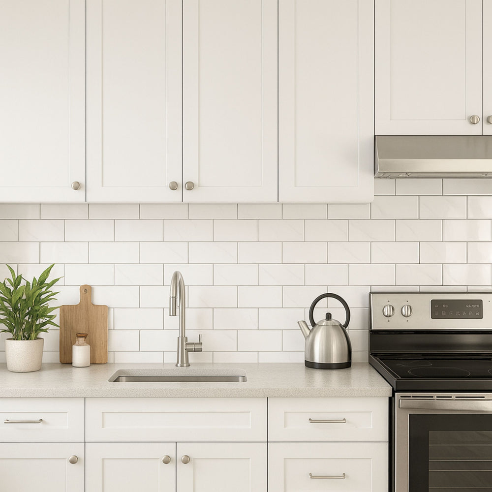 Stein Subway marmor selvklebende veggfliser imiterer klassisk hvit marmor med delikate grå marmoreringer og har ferdig grå fuger for et naturlig uttrykk. De selvklebende arkene monteres enkelt uten lim eller fugemasse, perfekt for rask oppgradering av kjøkken, bad eller vaskerom.