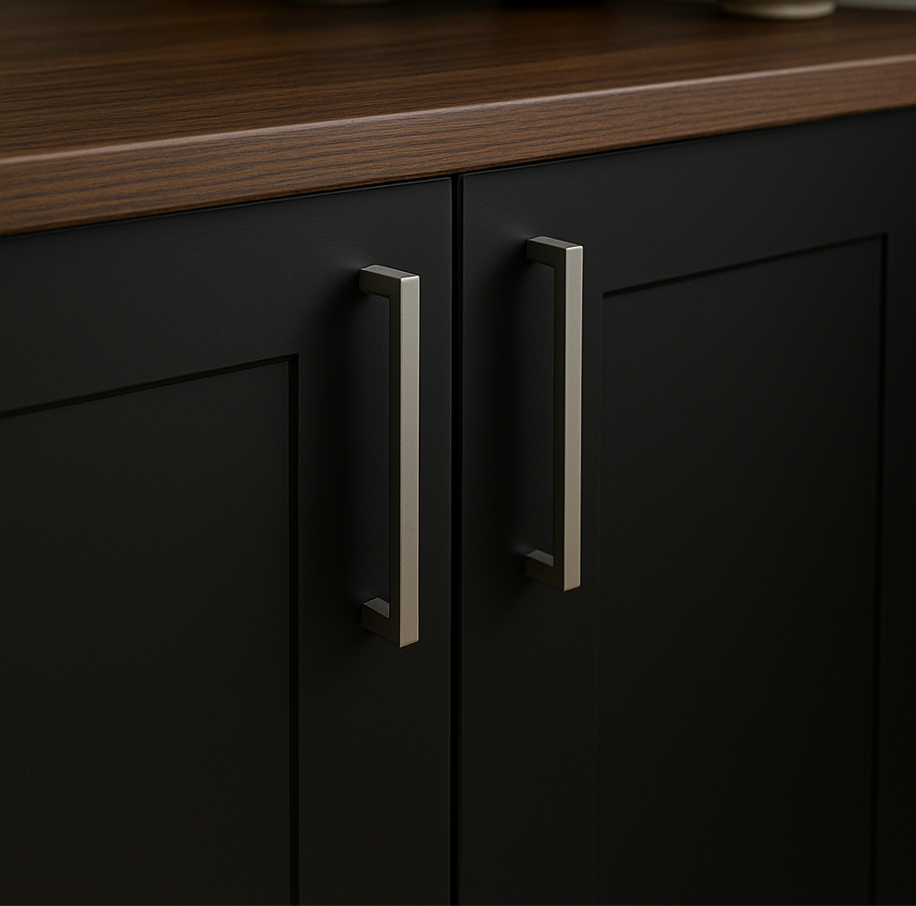Moderne håndtak i sølvfarget med rette kanter. Håndtakene har et moderne og minimalistisk design. Perfekt til kommoder, skap, bad og kjøkken.