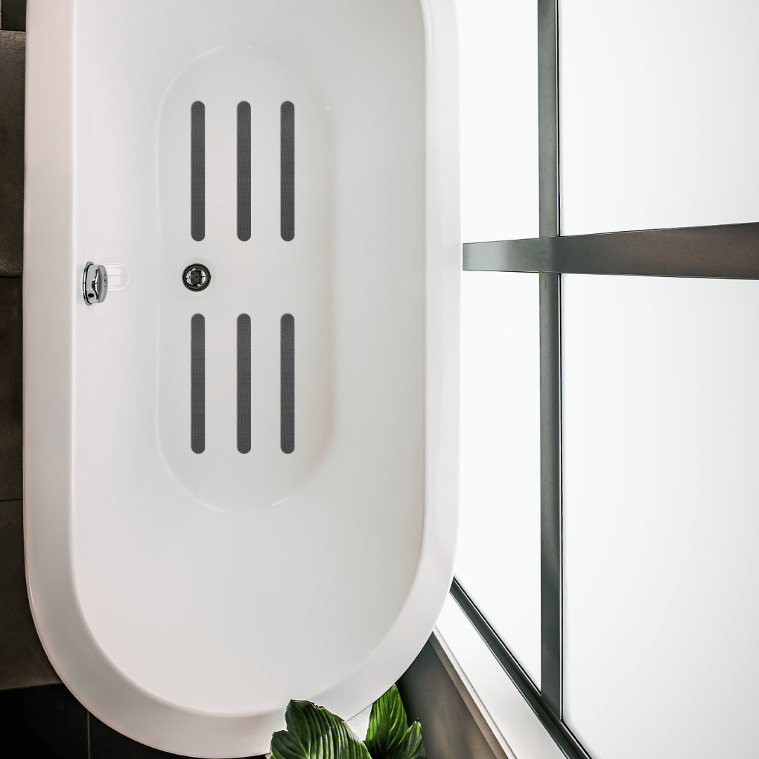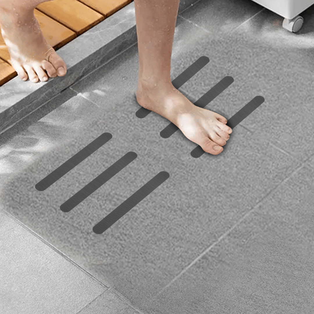 Selvklebende antiskli teip i mørk grå. Kommer i pakke med 24 stk sklisikker teip og en skrape. Sklisikre remser er perfekt til å festes på baderomsgulvet, i badekar, dusjen eller på trappen for å få bedre grep. Båndene kan festes med hjelp av medfølgende skrape.